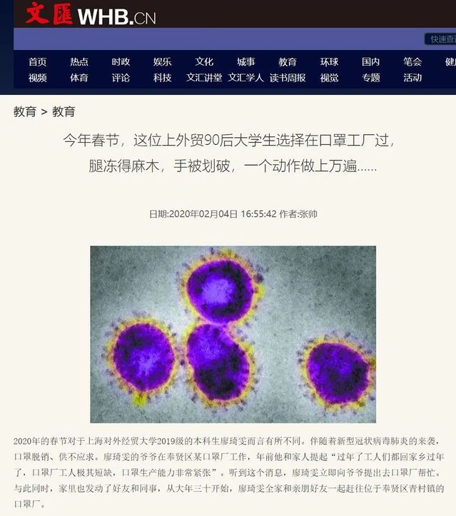 来自国际经贸学院的廖琦雯同学在疫情期间参加了口罩厂的工作。通过在口罩厂工作的爷爷,她了解到了目前口罩生产能力紧张的问题,得知消息后她立即提出去口罩厂帮忙的请求。春节期间,廖琦雯同学全家齐上阵,每天早上八点多到达工厂,晚上六七点到家,每天工作十余小时。作为一名大学生,面对疫情,她没有退缩,而是用实际行动助力口罩的生产,为前线医疗物资的保障尽己所能。
