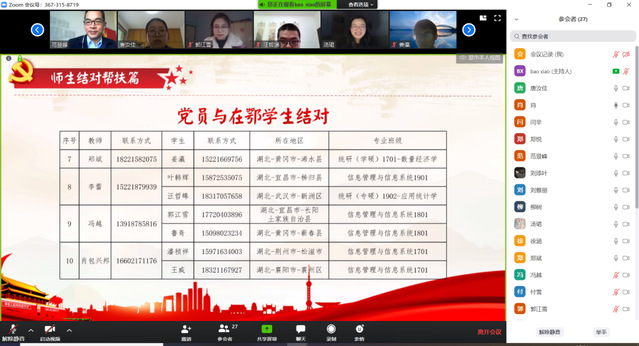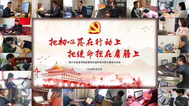 为坚决贯彻习近平总书记关于让党旗在防控疫情斗争第一线高高飘扬等重要指示精神,把党中央和市委的各项决策部署落到实处,充分发挥基层党支部的战斗堡垒作用和党员的先锋模范作用,取得疫情防控阻击战的最终胜利,3月20日下午,统计与信息学院在鄂师生临时党支部线上开展了以“把初心落在行动上、把使命担在肩膀上”为主题的党日活动。活动分为党支部成立、理论学习、结对帮扶、我向组织靠近、明志奋进、党员宣誓等6个篇章。临时党支部10名党员和14名在鄂学生(群众)参加了活动。