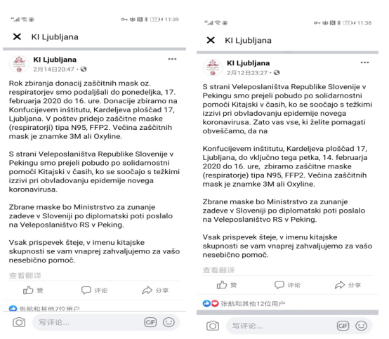 212日和14日,在获悉国内武汉等地急需防护物资消息后卢大孔院积极响应斯洛文尼亚政府号召,通过孔院社交媒体发布为中国捐赠口罩的通知,组织防护物质捐助,孔院部分教师也参与了声援祖国抗疫的视屏录制,与祖国同心抗疫。在做好自身工作的同时,卢大孔院还为阻击当地疫情做出贡献,组织和指导必赢626net入口首页赴斯洛文尼亚交换学生自我隔离,帮助其联系斯洛文尼亚驻中国使馆,协助在斯华人华侨对斯捐赠防疫采购物资等。