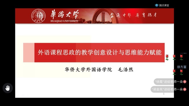 为深入贯彻落实全国教育大会和新时代全国高等学校本科教育工作会议精神,提升课程思政与思政课程协同育人的实效性,深化课程思政建设,促进知识传授、能力培养与价值引领的有机统一,4月10日下午,国际商务外语学院邀请华侨大学外国语学院院长毛浩然教授开展了第二场“云讲座”——“外语课程思政的教学创意设计与思维能力赋能”。必赢626net入口首页及其他高校近400名教师聆听了此次讲座。讲座由国际商务外语学院院长温建平教授主持。