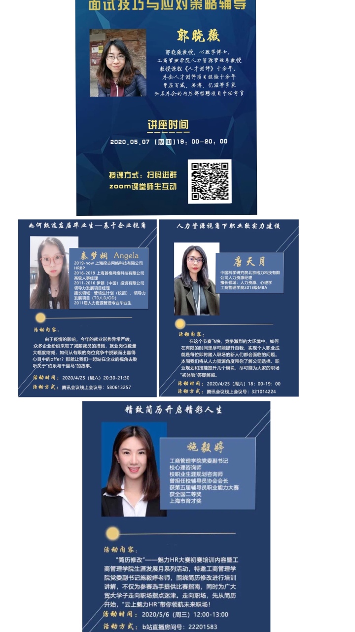 学院主动创新工作模式,细化各类教职工帮扶内容,努力为毕业生提供更多的就业资源和更好的就业服务,做到一人一方案,云端有温度。学院党委牵头,师生党支部结对,联动辅导员、系主任、班主任、学业导师、人生导师、校外导师等“1+X”育人队伍,针对学业、就业、升学、出国等毕业班学生的不同需求,通过线上直播、答疑、会议等形式建立“云+X”分类帮扶机制,分别成立面试技巧指导、考研复试帮扶、出国留学等12个微信群。人力资源管理系教师运用专业所长开展简历撰写、面试指导专场讲座3场,点对点帮助学生修改简历30余份,“靶向”施策,走深走实各项帮扶工作。