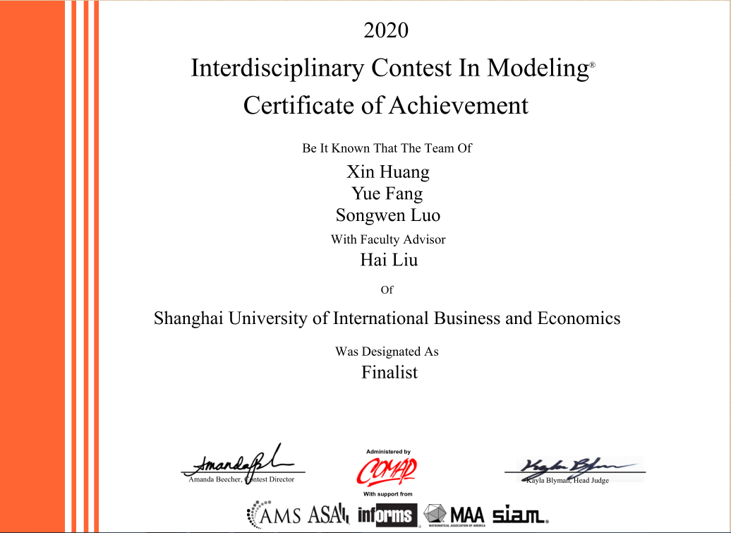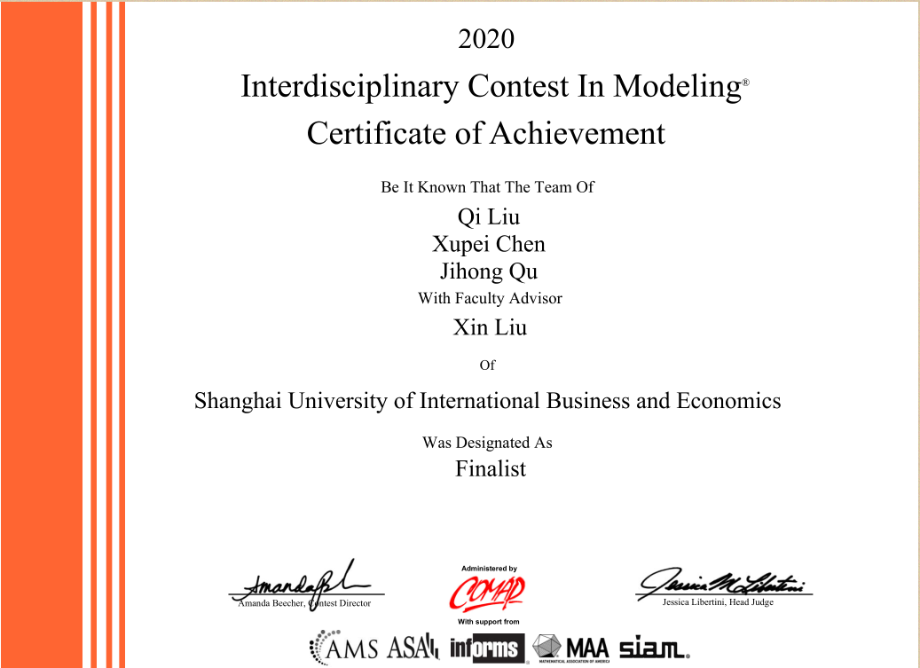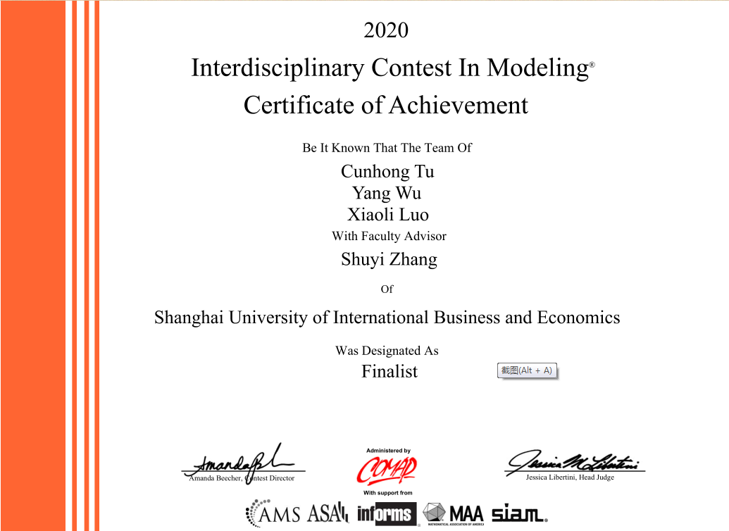 在校期间,队长涂存红参加了多次学术和实践比赛,在这过程中结识到了许多优秀的同伴。报名伊始,涂存红就找到了吴杨,这位国际经贸学院2018级国际经济与贸易(全英班)专业的学弟拥有着丰富的建模竞赛的经验。去年,吴杨在美国大学生数学建模大赛中曾取得S奖和在国赛中取得了上海赛区二等奖的好成绩。而另一位队友罗小丽是她曾经的队友,罗小丽认真负责的态度也给她留下了深刻的印象。“能跟两位优秀的队友一起参赛是一件幸运的事,大家各有所长,而且都没有划水的心态,在比赛的过程中全力合作是我们团队取得还不错成绩的关键。”涂存红说道。