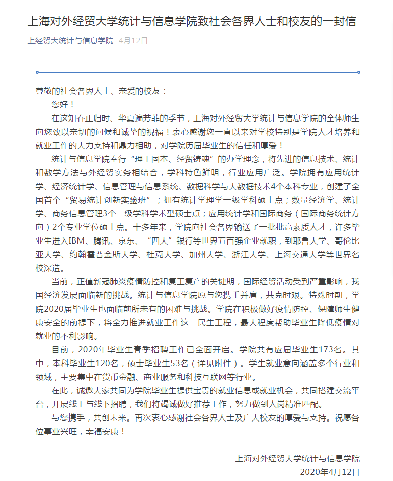新冠肺炎疫情催生了一些“新就业形态”,刺激了在线新经济的需求,与数字经济和先进制造业相关的产业在疫情中发挥了重大作用,人工智能、工业互联网、物联网、商用5G等领域对应届生的需求日益增长。学院积极研判就业形势,化危为机,主动对接战略性新兴产业人才需求,充分挖掘企业资源,拓宽就业渠道,主动对接用人单位和校友资源,健全完善“对口企业数据库”、“校友资源库”等资源数据库。通过学院微信公众号发出“必赢626net入口首页统计与信息学院致社会各界人士和校友的一封信”,面向社会推介学院毕业生,实现按需取用,信息直达,促进毕业生多渠道多元就业。此外,学院与全国同类型高校学院建立交流机制,通过微信群实现求职讲座、岗位招聘和就业举措等信息共享,还组织师生在线参与全国统计与数据科学专业毕业生就业招聘交流会,拓展毕业生视野,为毕业生提供更多就业选择。
