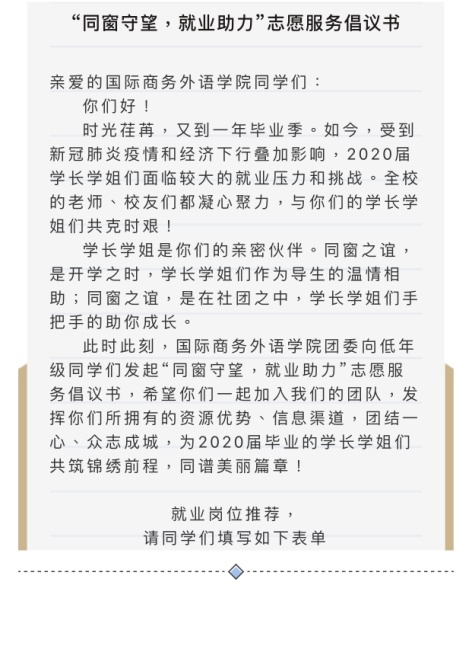 受到新冠肺炎疫情和经济下行双重压力影响,今年的大学生就业形势十分严峻,牵动着每个人的心。国际商务外语学院把学生就业作为全局工作的重中之重,始终保持高度重视,着力推进领导班子带头,全员发动、全程推进、全力以赴,察实情、出实招、求实效。
