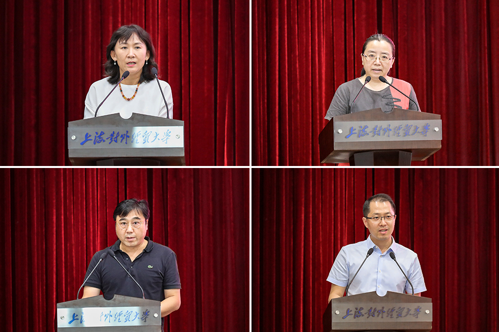 国际商务外语学院党委书记张嵘、外事处处长邹囡囡、法学院院长张庆麟、会展与旅游学院院长王春雷分别代表各小组汇报研讨情况。