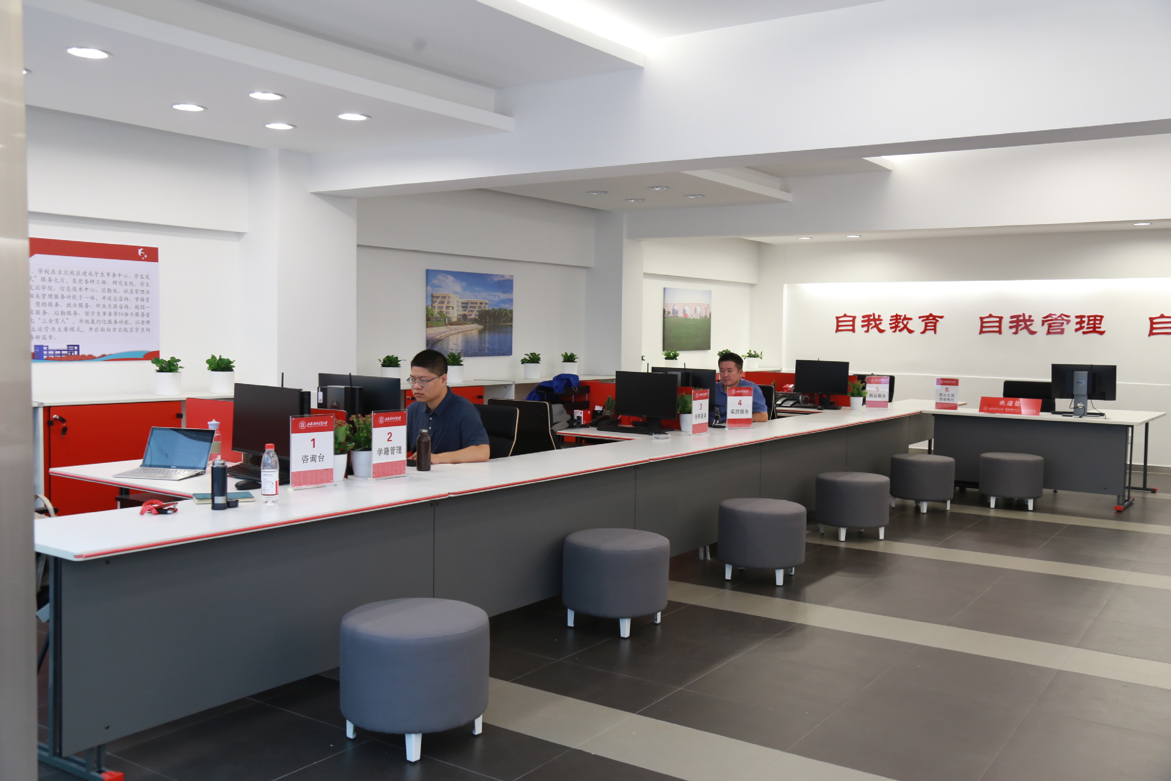 为了给新入住学生提供良好的学习、生活环境,学校成立了工作协调机构,统筹负责古北校区宿舍修缮、环境整治、文化氛围营造等工作。经过学校各部门的通力合作,尤其是克服新冠疫情等客观因素的影响,圆满完成了古北校区图书馆、宿舍、体育馆、食堂、教学楼、校门、知识门、绿化等的改造和修缮,古北校区环境焕然一新。学校为入住古北校区的学生提供行李托运和转接服务,并安排学生志愿者为学生的到来和入住提供指引和帮助。为做好古北校区学生的管理和服务工作,学校在古北校区博观楼一楼设立了学生事务中心,为在古北校区学习和生活的学生提供支持和帮助。