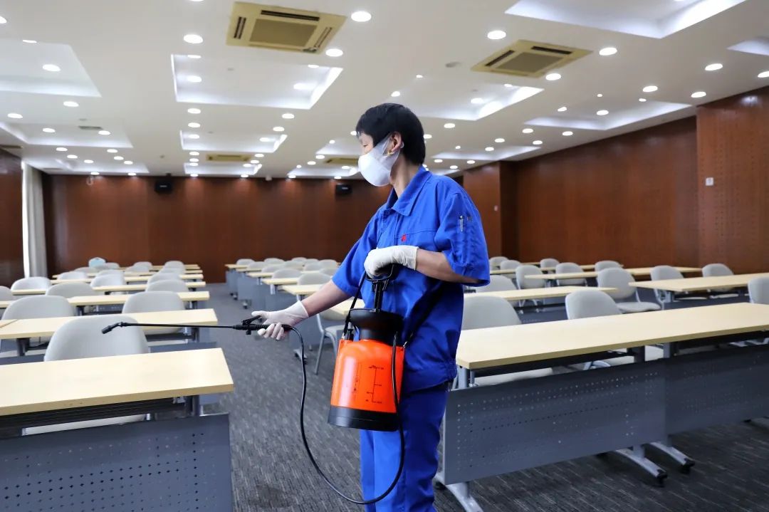 物业定期做好公共区域,如门厅、楼道、电梯、会议室、卫生间等重要场所和设施的清洁和消毒工作,确保校园卫生安全。