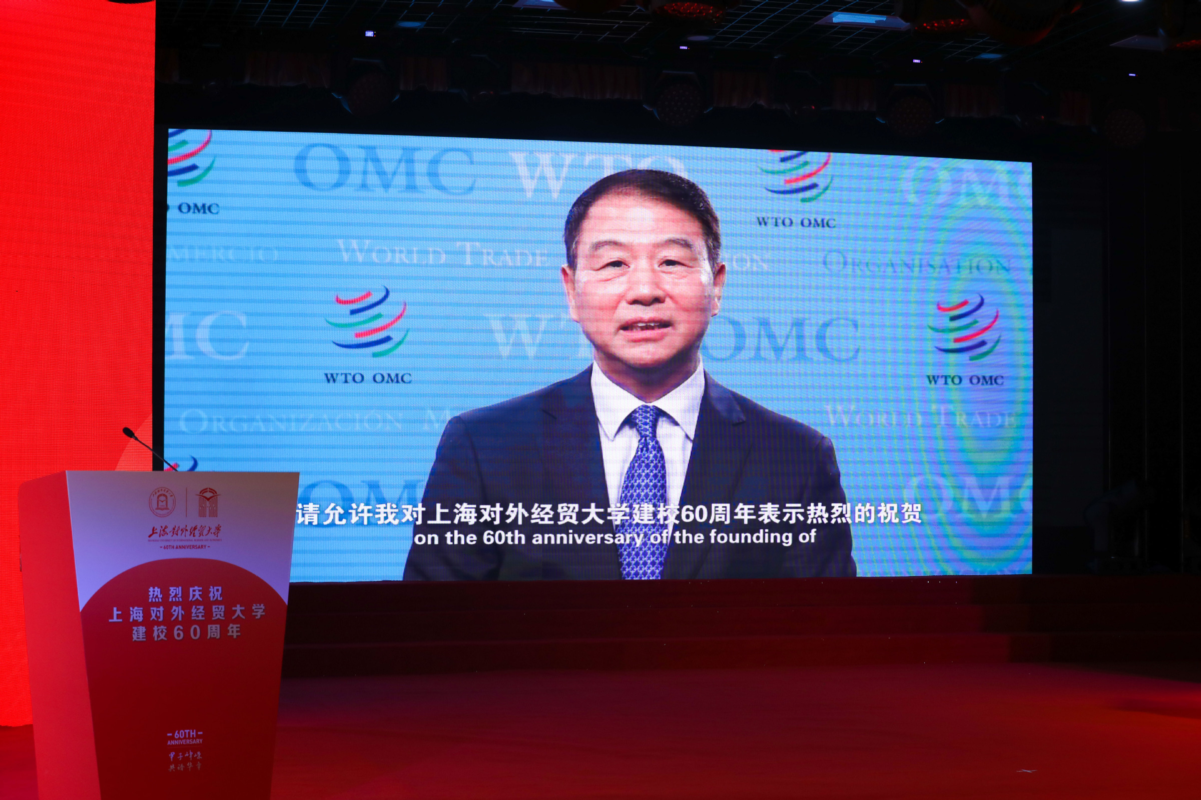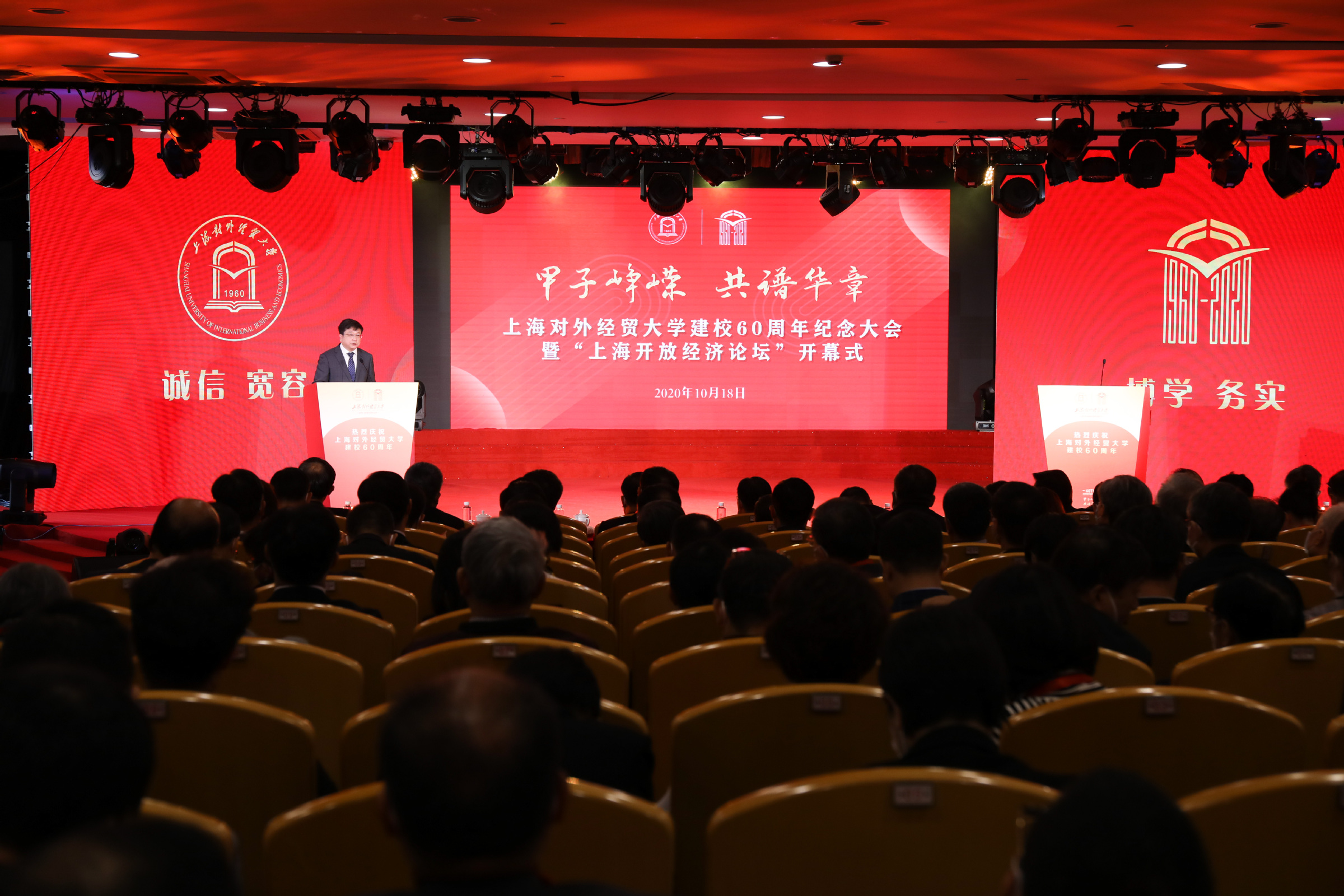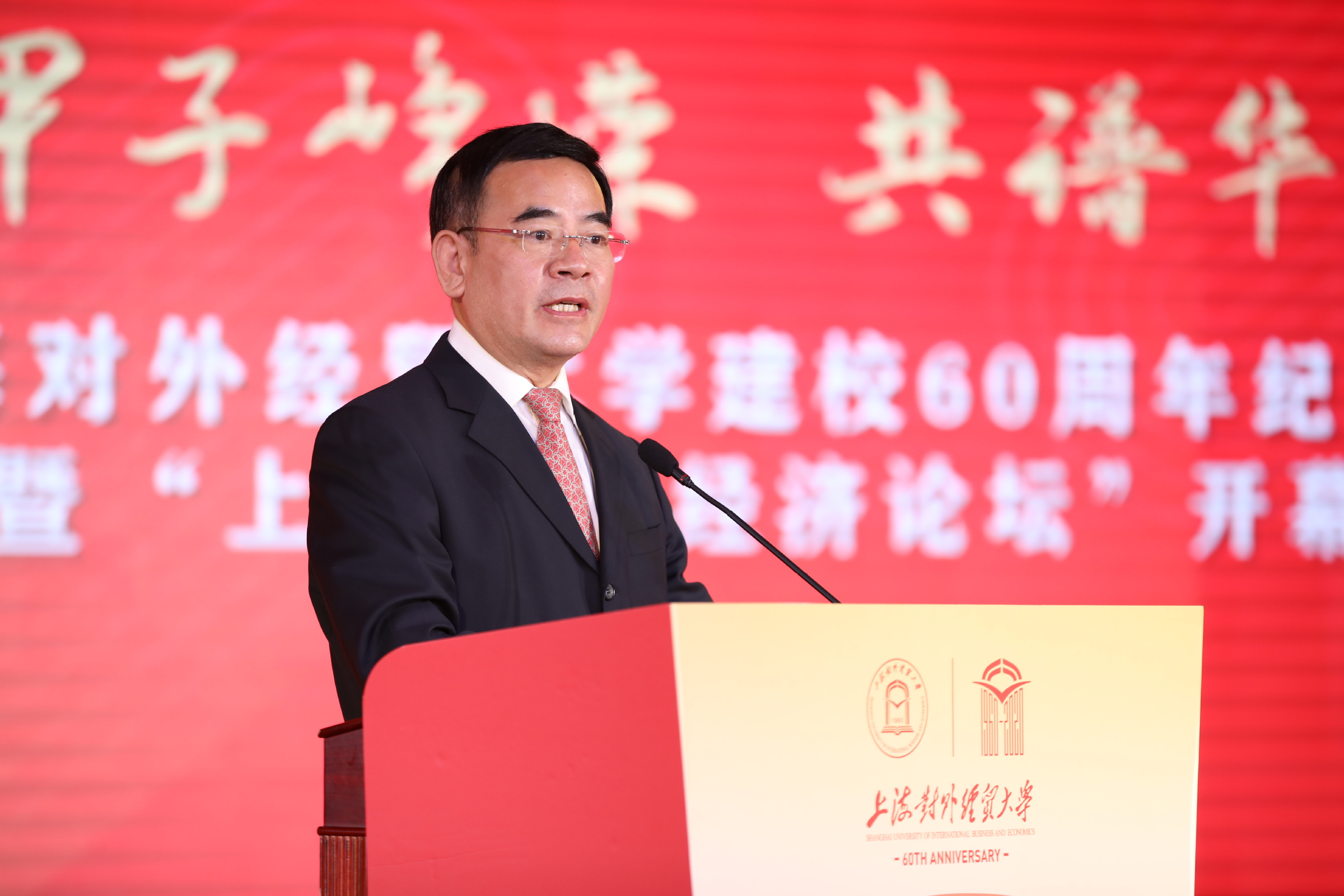 校长汪荣明在致辞中回顾了学校建校60年的发展历程。60年来,学校牢记为党育人、为国育才使命,服务创新型和开放型经济的国际经贸人才培养成绩卓著;坚守经世致用的学术宗旨,服务国家战略和上海城市发展的学术创新成果不断涌现;恪守文化传承创新职责,服务对外开放的国际化办学和文化育人成效不断彰显。汪荣明指出,面向未来,学校将以落实立德树人根本任务为天职,矢志不渝培养一流人才;以服务国家战略和上海高质量发展为使命,源源不断推出一流成果;以服务国家总体外交和开放战略为己任,持续打造一流的学术和文化交流平台。学校将以习近平新时代中国特色社会主义思想为指导,扎根中国大地办大学,紧紧围绕“高水平、国际化、特色鲜明的应用研究型大学”办学定位,牢牢把握“双一流”和贸易强国建设契机,努力向国内一流、国际知名的财经类大学目标迈进。