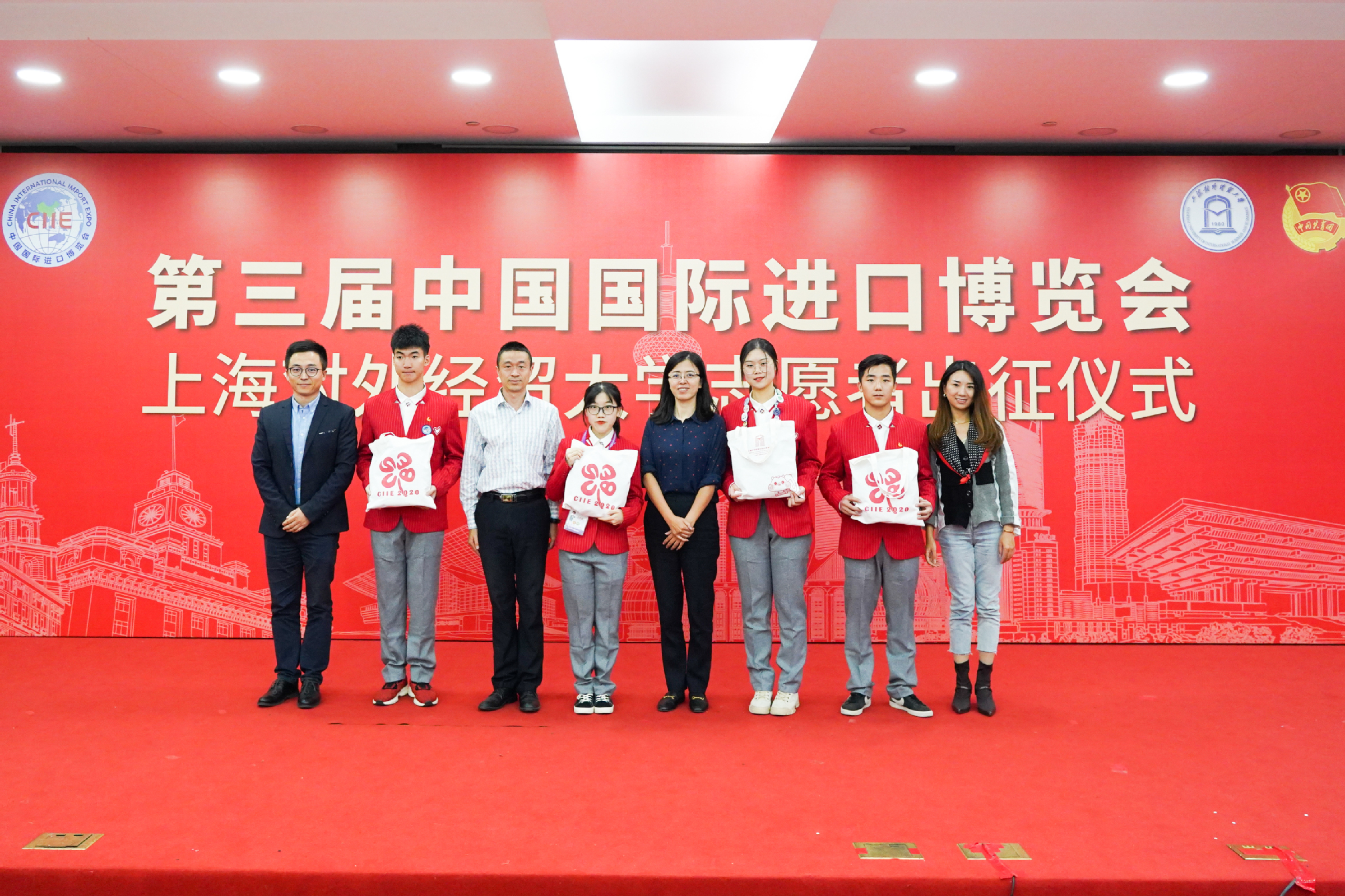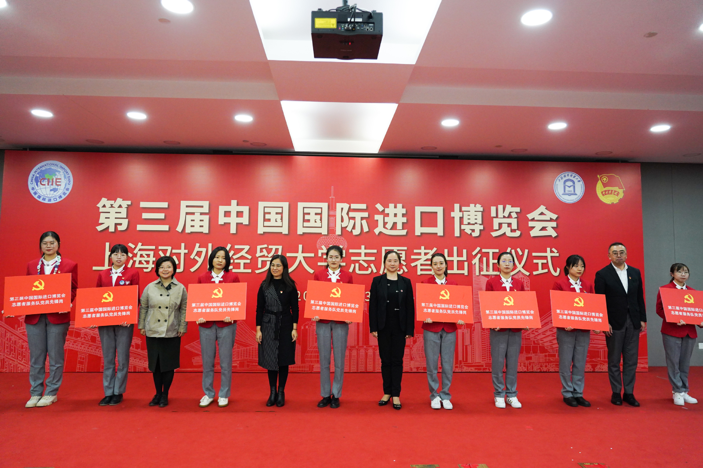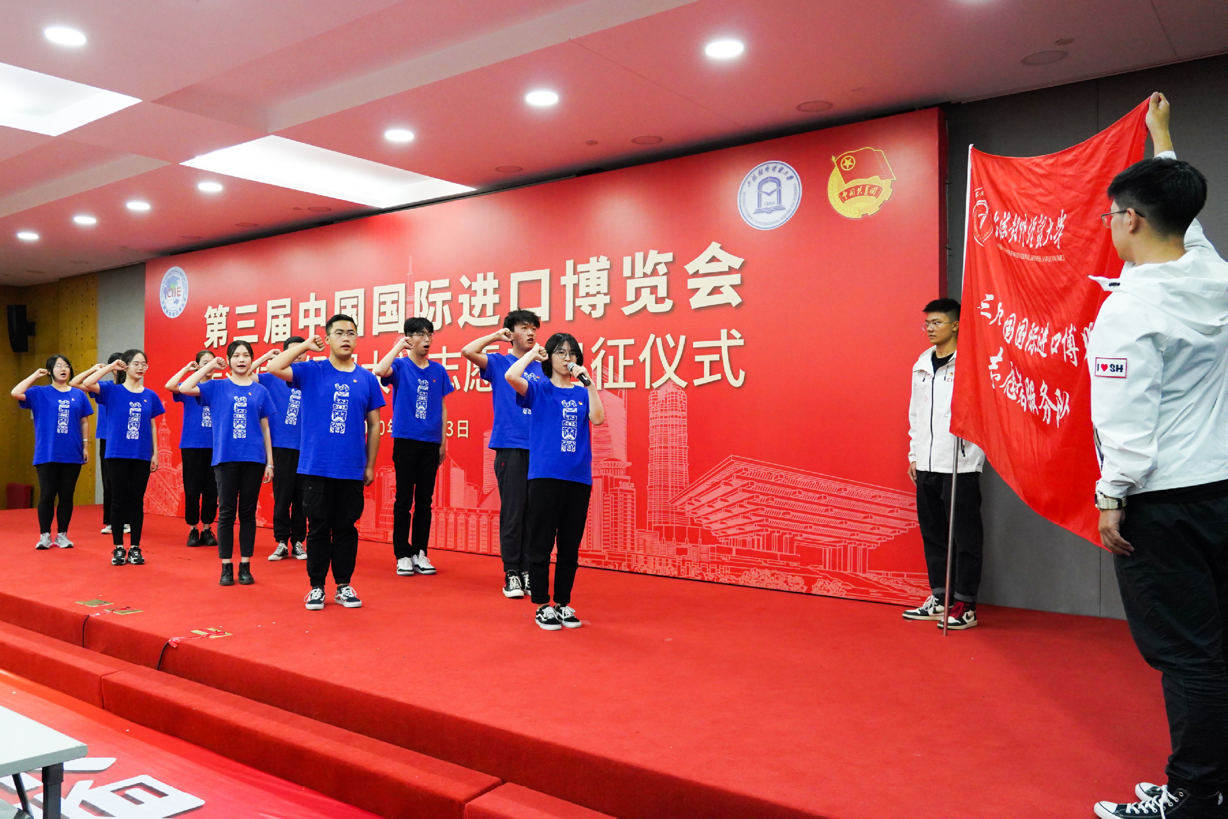 出征仪式最后,全体志愿者宣誓:“奉献有爱,互助进步,追求卓越,全力以赴,为祖国增光,为城市添彩,向前进,博青春,为进博,一起来!”上经贸大“小叶子”将继续服务进博、奉献进博、建功进博。