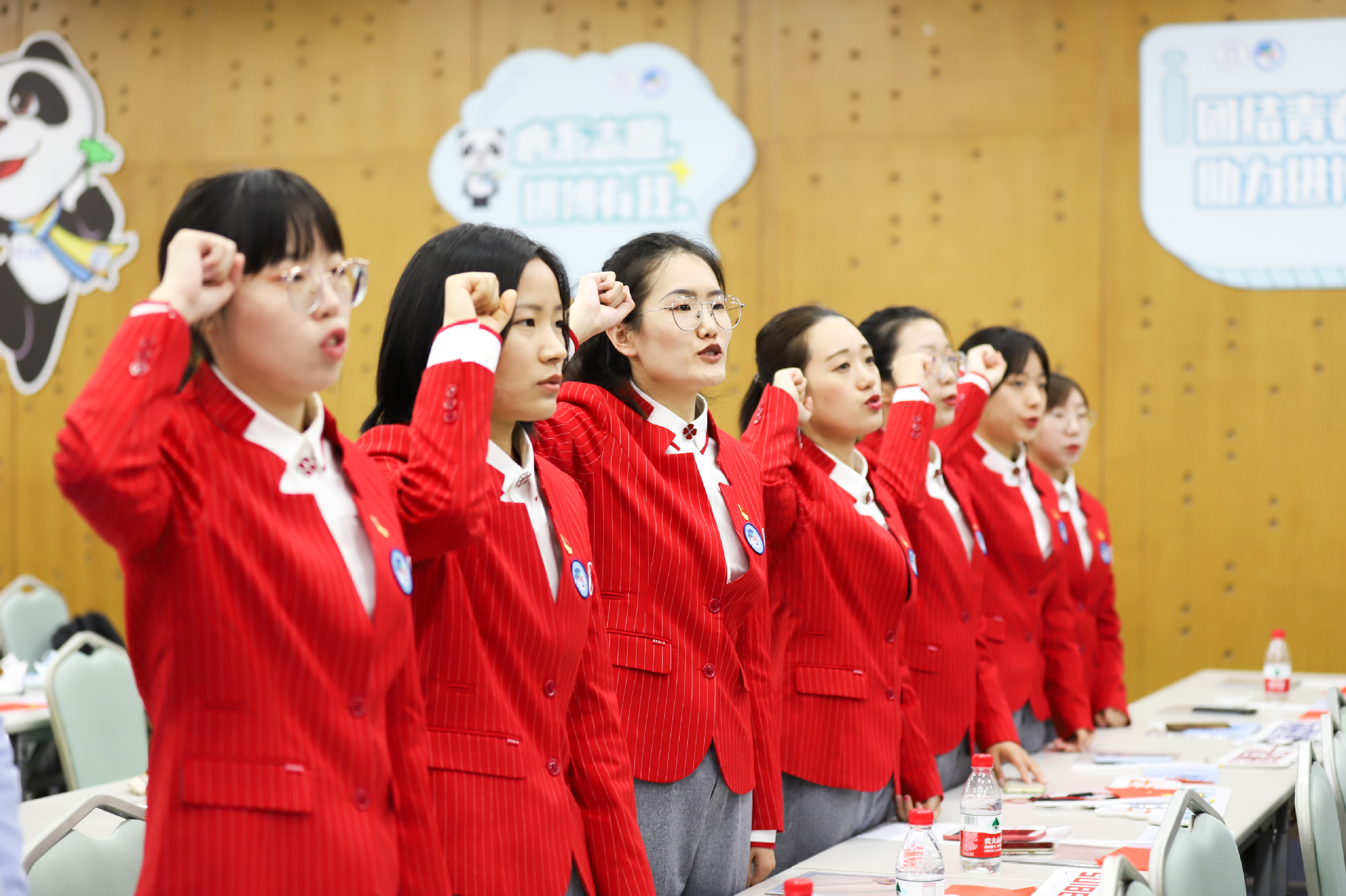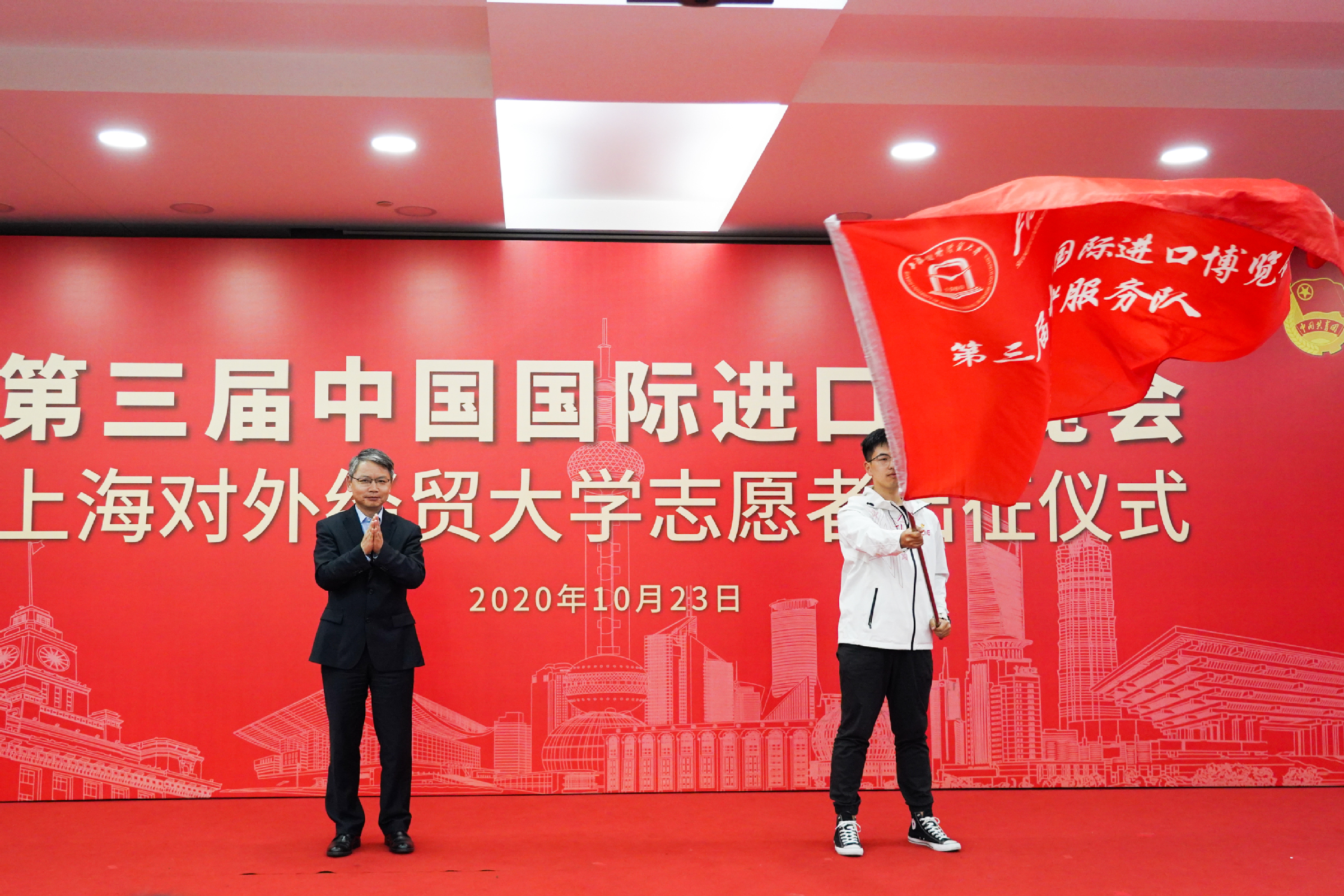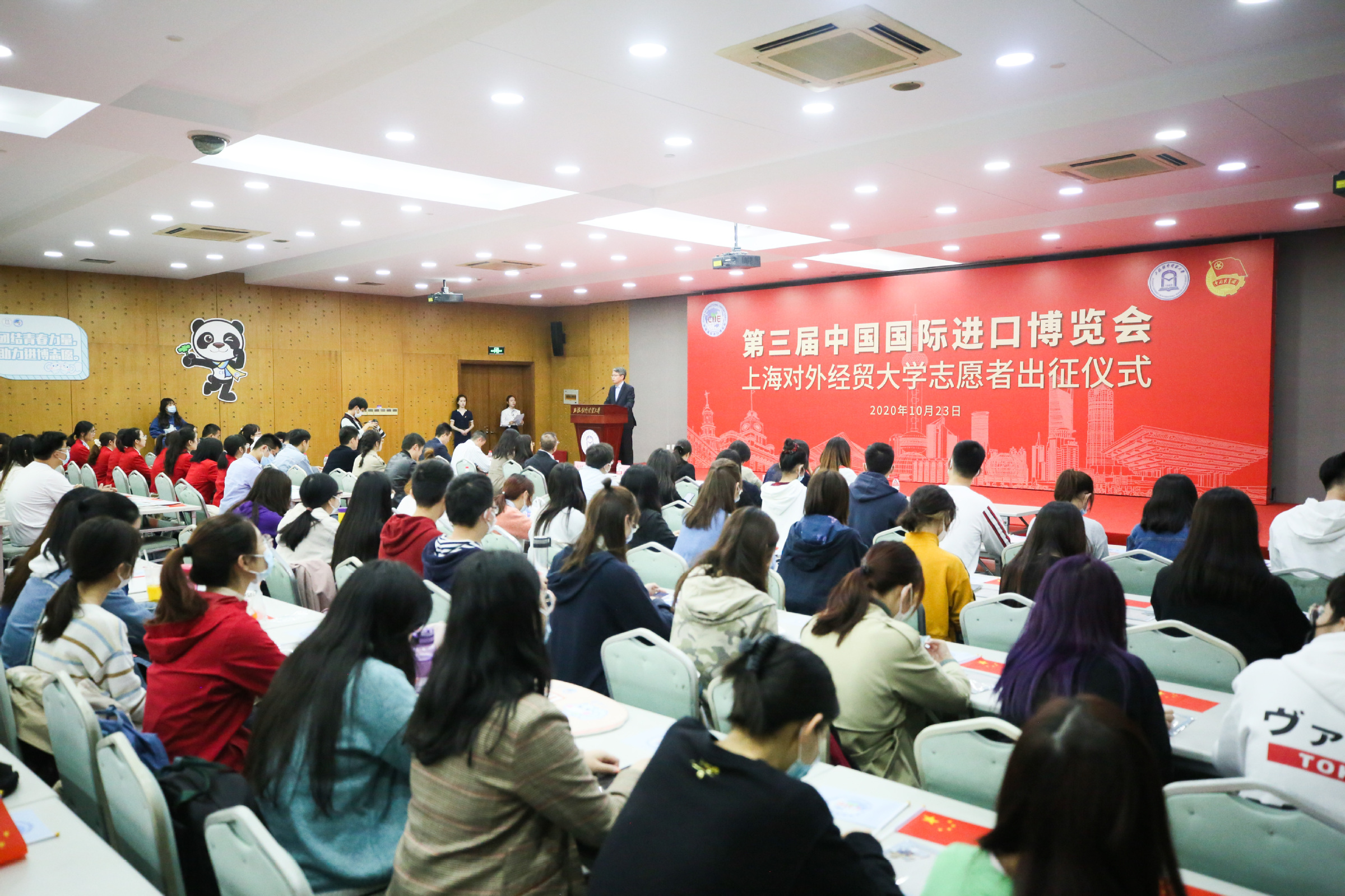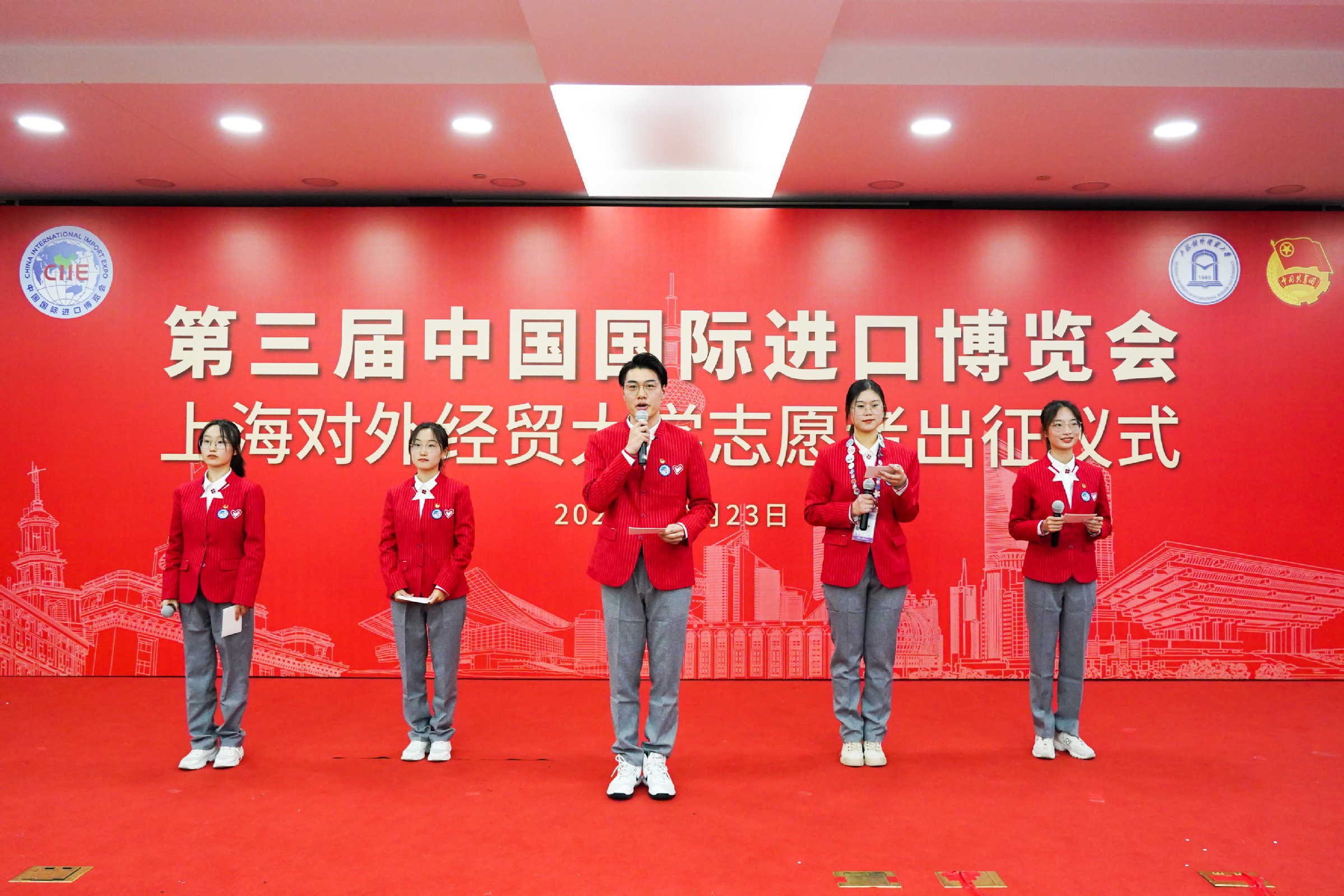 出征仪式最后,全体志愿者宣誓:“奉献有爱,互助进步,追求卓越,全力以赴,为祖国增光,为城市添彩,向前进,博青春,为进博,一起来!”上经贸大“小叶子”将继续服务进博、奉献进博、建功进博。