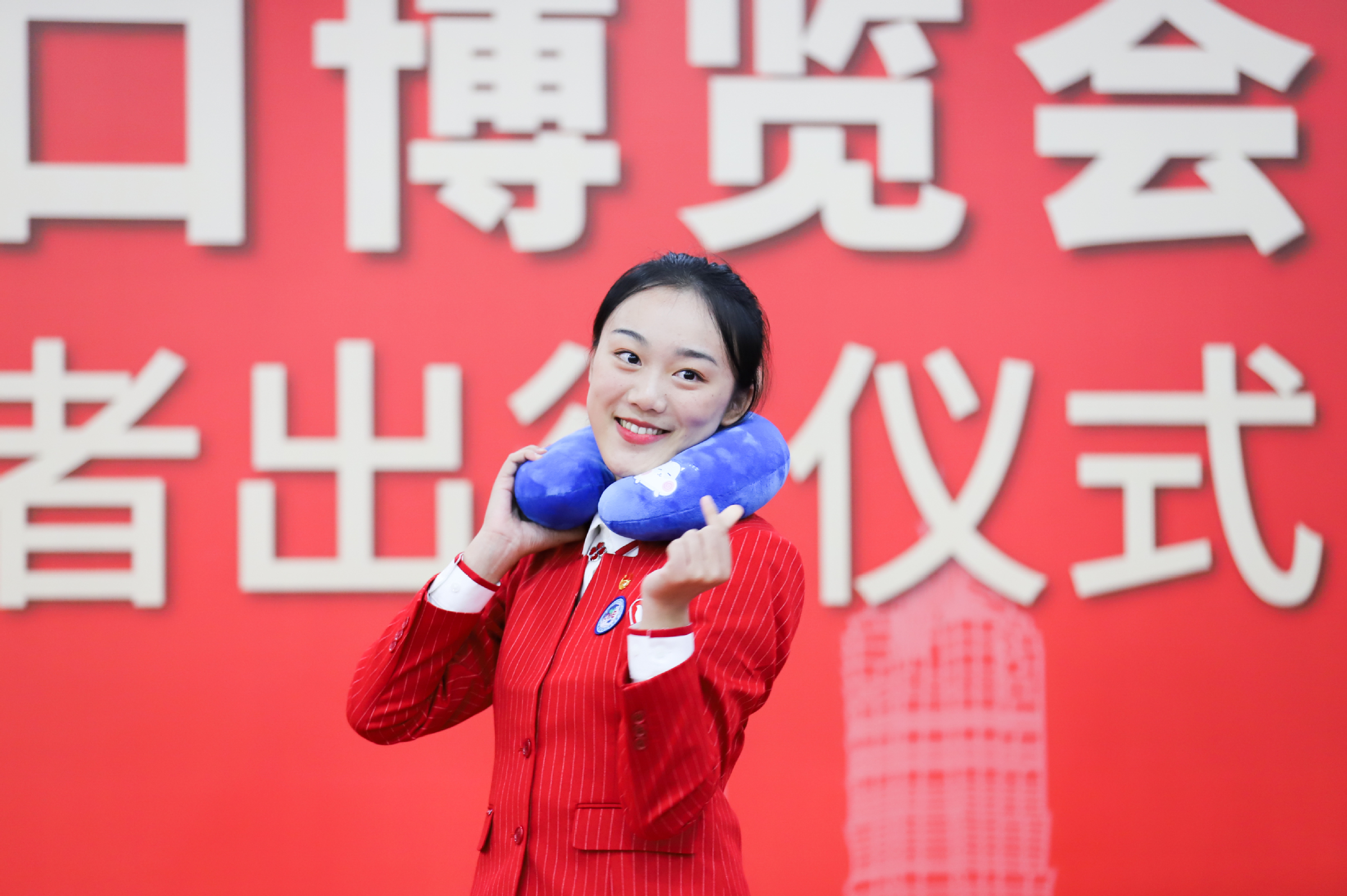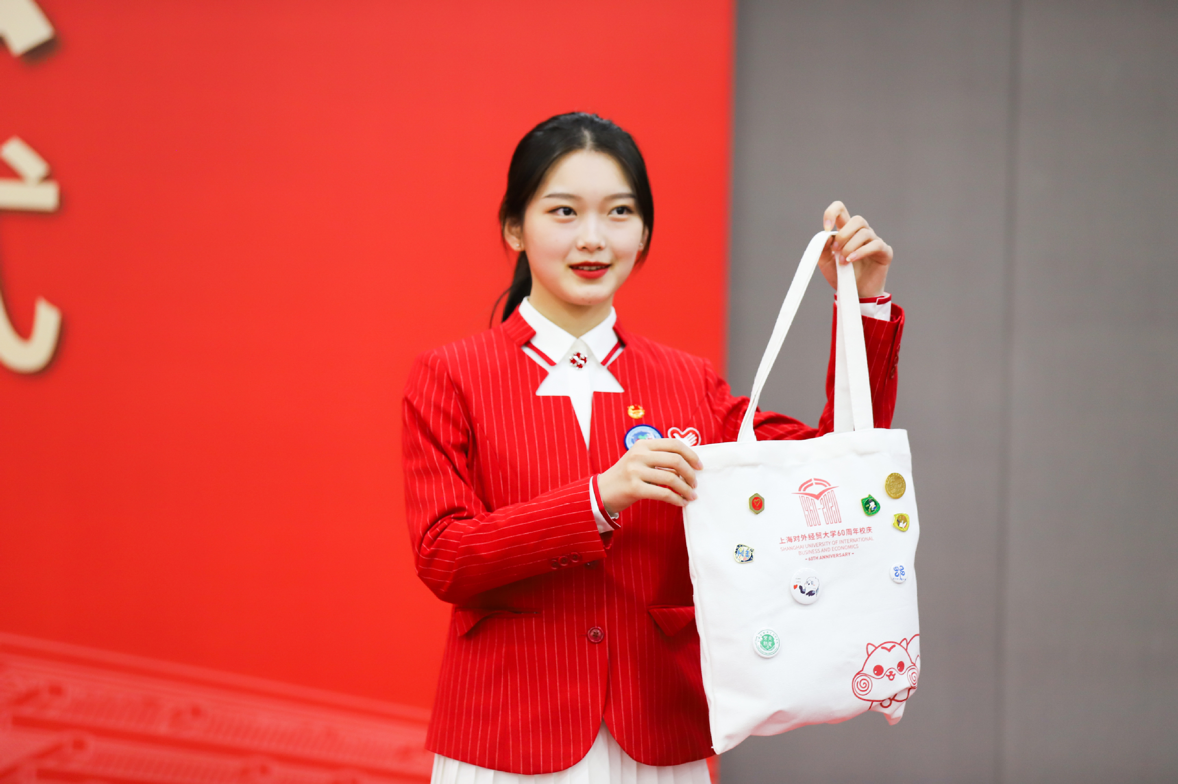 出征仪式现场还发布了进博U形枕、帆布包、眼罩、拼图等进博会志愿者文创产品。各学院党委副书记为进博会“小叶子们”赠送进博会定制加油大礼包。