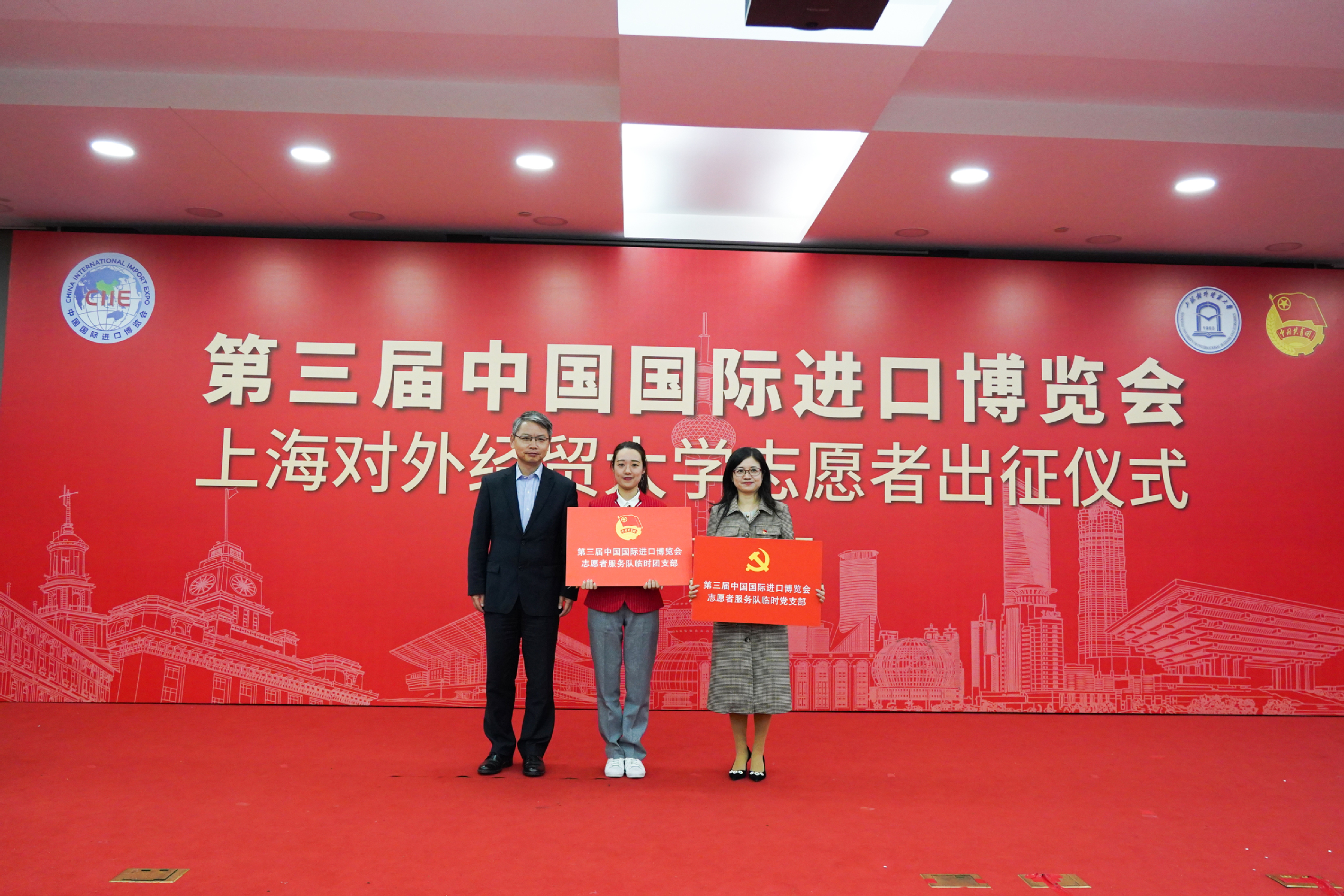 出征仪式上,祁明为第三届中国国际进口博览会志愿者临时党支部、临时团支部授牌,为第三届中国国际进口博览会必赢626net入口首页志愿者服务队授旗。与会领导分别为第三届中国国际进口博览会志愿者党员先锋岗授牌。