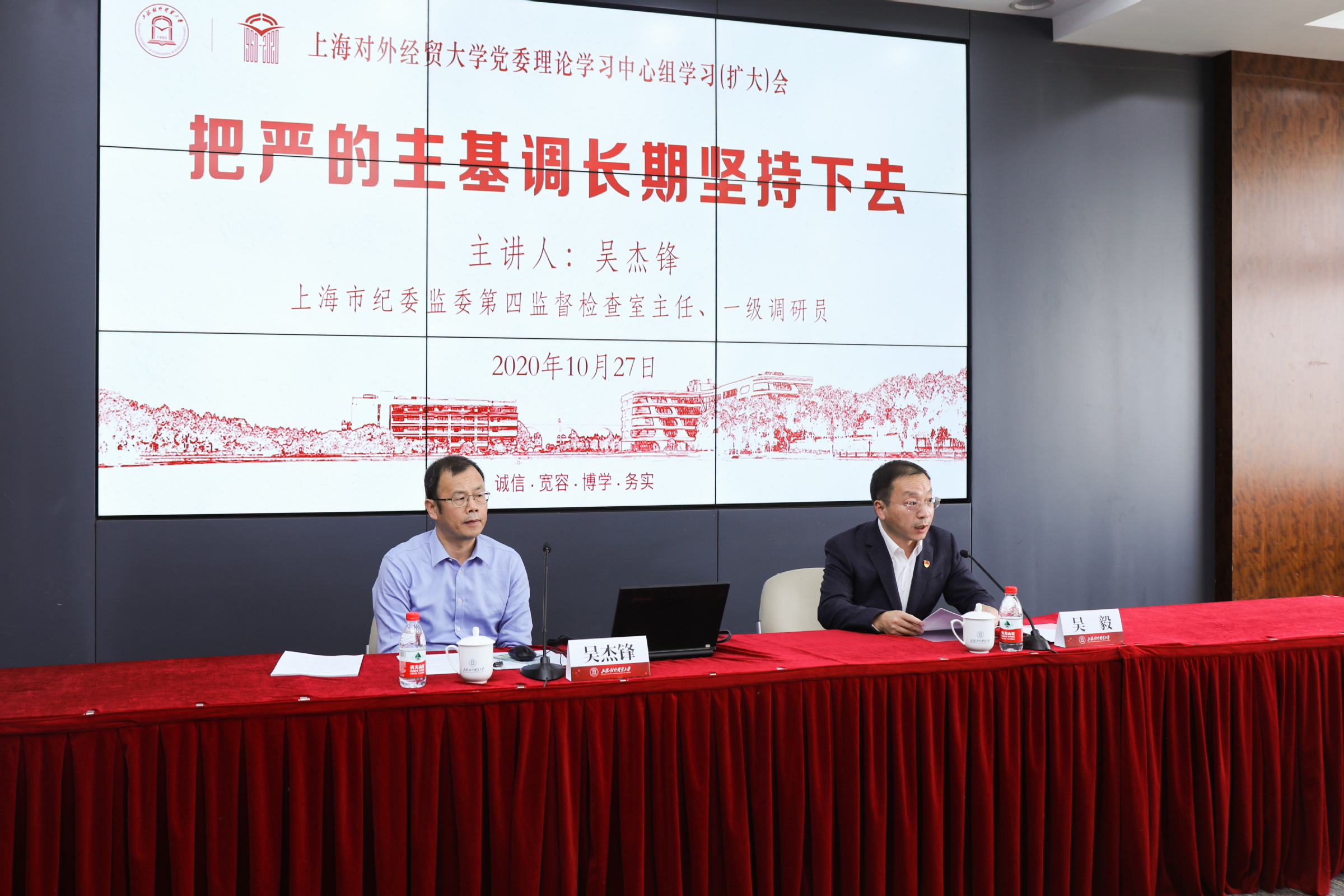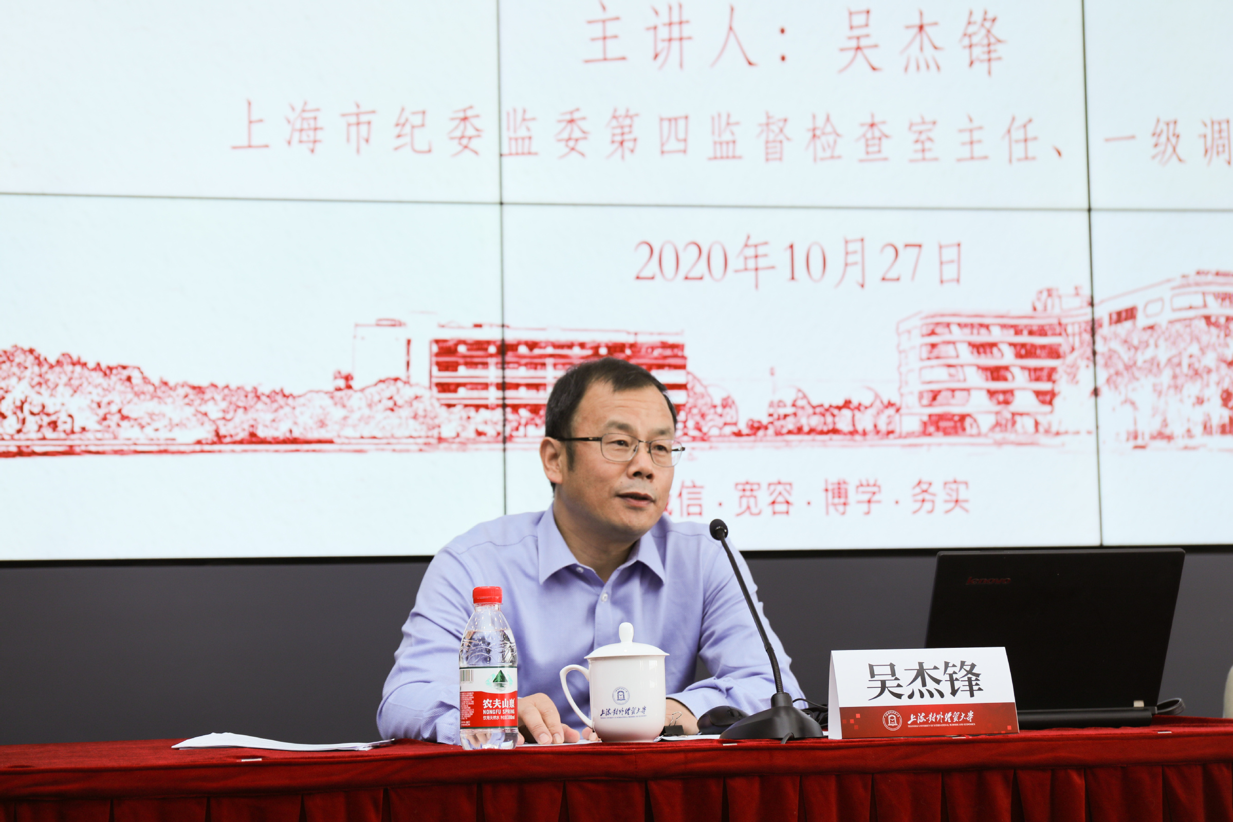 为进一步贯彻落实习近平总书记重要讲话精神,深入分析新时代全面从严治党新形势新任务新要求,10月27日下午,学校党委理论学习中心组召开学习(扩大)会,邀请上海市纪委监委第四监督检查室主任、一级调研员吴杰锋作题为“把严的主基调长期坚持下去”专题辅导报告。党委理论学习中心组成员、中层干部、巡察办成员、巡察组成员、学校第五期青年骨干教师培训班学员参加学习会。会议由校党委副书记吴毅主持。