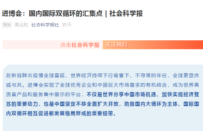 11月10日,国际经贸学院副院长高运胜教授在《社会科学报》上发表理论文章《进博会:国内国际双循环的汇集点》。文章认为本届进博会的举办是新一轮高水平对外开放的重要标志,是双循环相互促进的重要节点,是创新驱动与新旧动能转换的重要抓手。进博会通过内外双循环相互促进建设未来发展新格局,表明中国坚持以开放求发展、共建开放合作世界经济的责任担当与坚定决心,通过发挥内需潜力,更好联通国内国际市场,在更高起点上为推动中国形成更高层次改革开放新格局,对全球经济恢复增长,共享机遇、共同发展贡献力量。