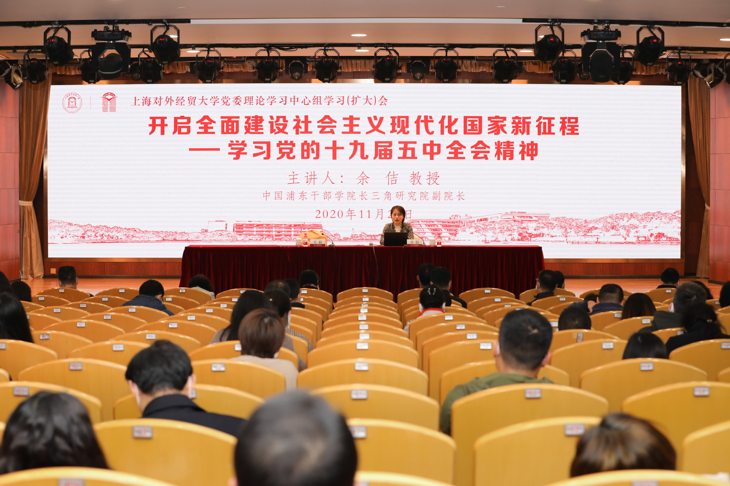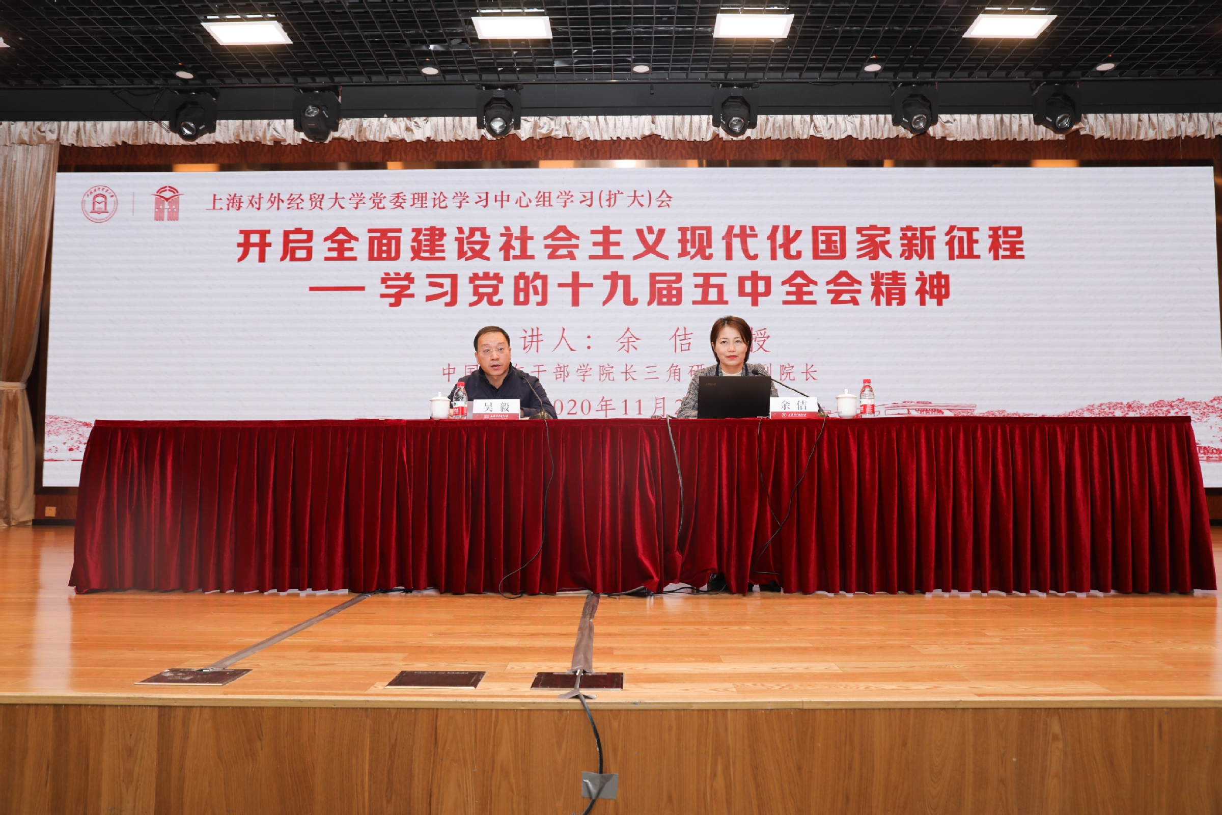 为进一步深入学习十九届五中全会精神,充分认识全会召开的重大意义和历史使命,准确把握会议精髓要义、科学内涵,11月24日下午,学校党委理论学习中心组召开学习(扩大)会,邀请市委十九届五中全会宣讲团成员、上海市习近平新时代中国特色社会主义思想研究中心特邀研究员、中国浦东干部学院长三角研究院副院长余佶教授作主题为《开启全面建设社会主义现代化国家新征程——党的十九届五中全会精神解读》专题辅导报告。学校党委理论学习中心组成员、中层干部、全体党支部书记、各二级单位组织员、全体辅导员、第五期青年骨干教师培训班学员等参加学习会。会议由校党委副书记吴毅主持。