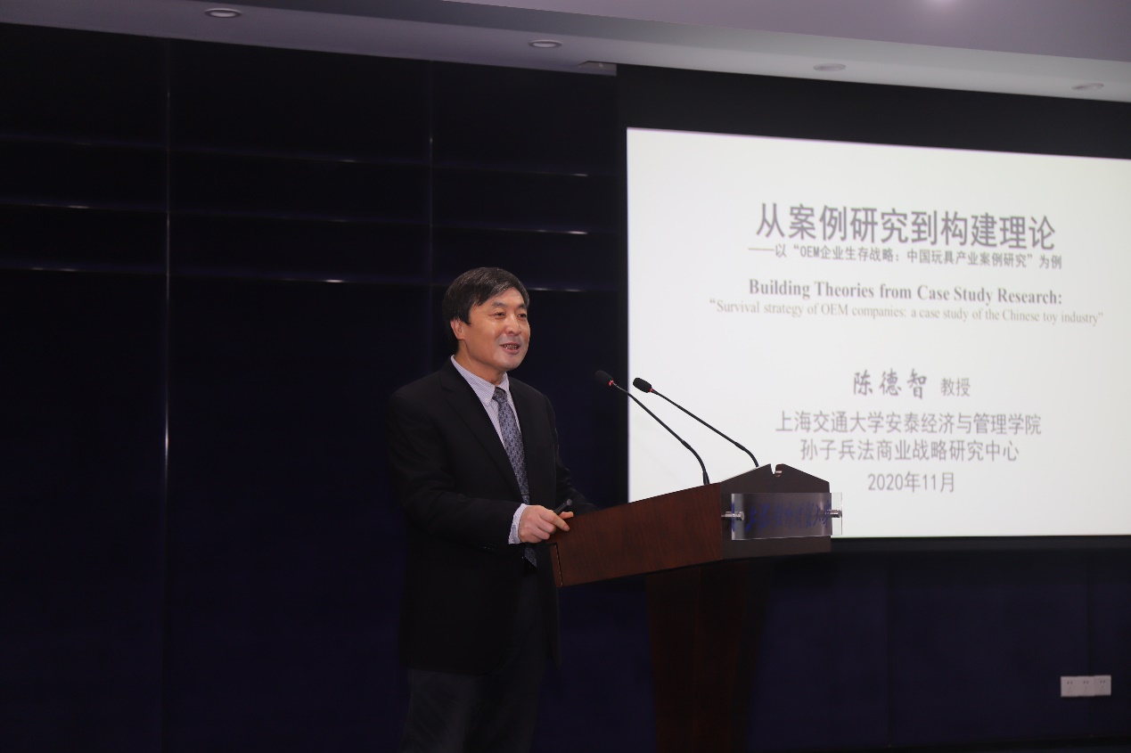 上海交通大学安泰经管学院博士生导师、案例中心执行主任陈德智教授以“案例研究到理论构建”为主题发表主旨演讲,他结合自己对全球玩具产业链的16家企业进行嵌入式多案例纵向研究,构建了OEM企业生存战略路径理论,此研究成果发表在国际高水平期刊上,且被高影响因子期刊引用。当今全球价值链正在进行着深度调整与重塑,陈德智教授的研究能够给到正在迈向全球价值链中高端的中国企业具有现实指导意义,也向与会的师生强调了案例研究的更高层次是理论的构建。