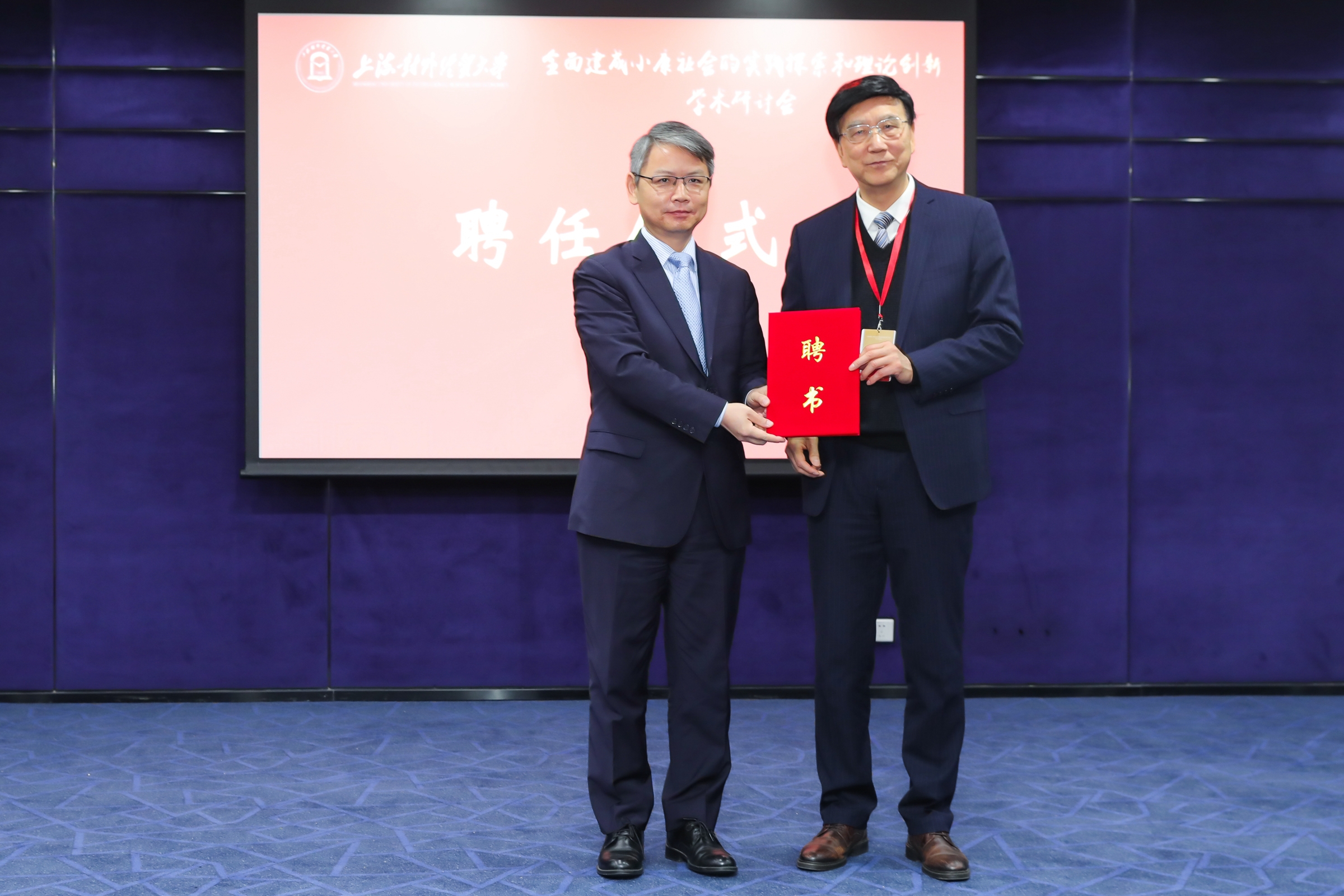 校党委副书记、副校长祁明教授为程恩富教授颁发特聘教授聘任证书,并主持大会主旨报告。