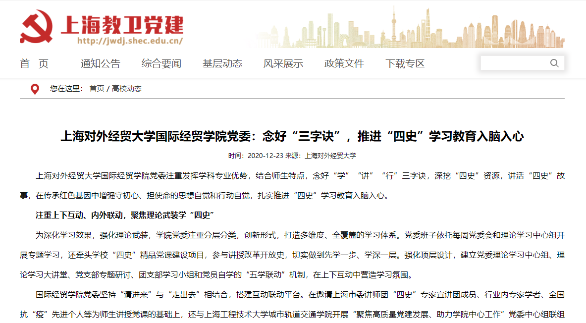 近期,上海基层党建网、上海教卫党建网分别以题为《必赢626net入口首页:念好“三字诀”,助推“四史”学习教育入脑入心》、《必赢626net入口首页:激活语言红色基因,讲好“四史”中的外语故事》的文章,“学习强国”平台发布“必赢626net入口首页‘四史’系列微党课”,连续宣传报道必赢626net入口首页“四史”学习教育成效,引起广泛社会关注。