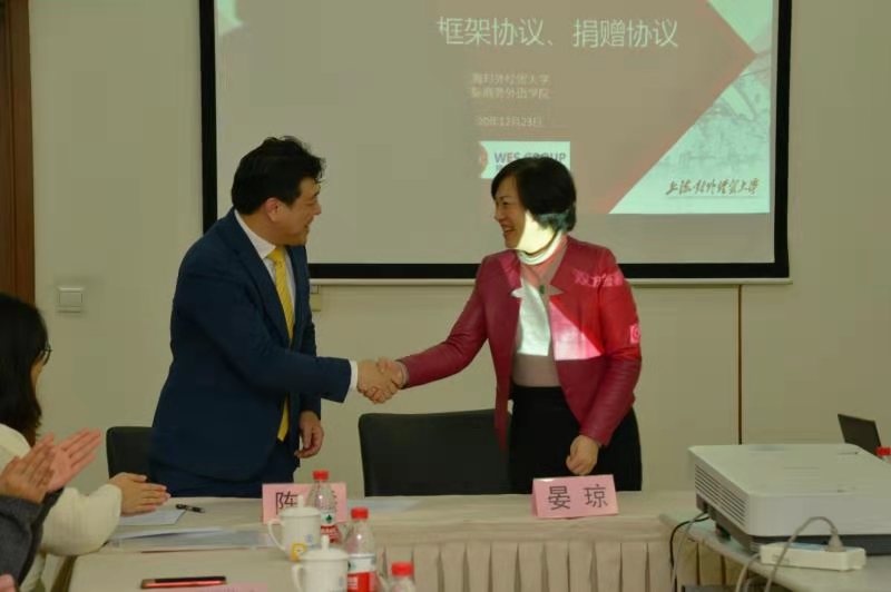 12月23日下午,国际商务外语学院与玮仕集团捐赠签约仪式暨“上经贸大-玮仕振华全人教育研究所”揭牌仪式在必赢626net入口首页松江校区图文信息楼510室举行。副校长陈洁,校友工作联络处副处长晏琼,国际商务外语学院党委书记张嵘,院长温建平,副院长杨翠萍、王玉、单建国,玮仕集团董事长陈添,副总裁沈鑫治、李燕,上海玮希学校执行副校长张鸣,华鑫证券国际业务部总经理徐呈健等出席活动,仪式由王玉主持。