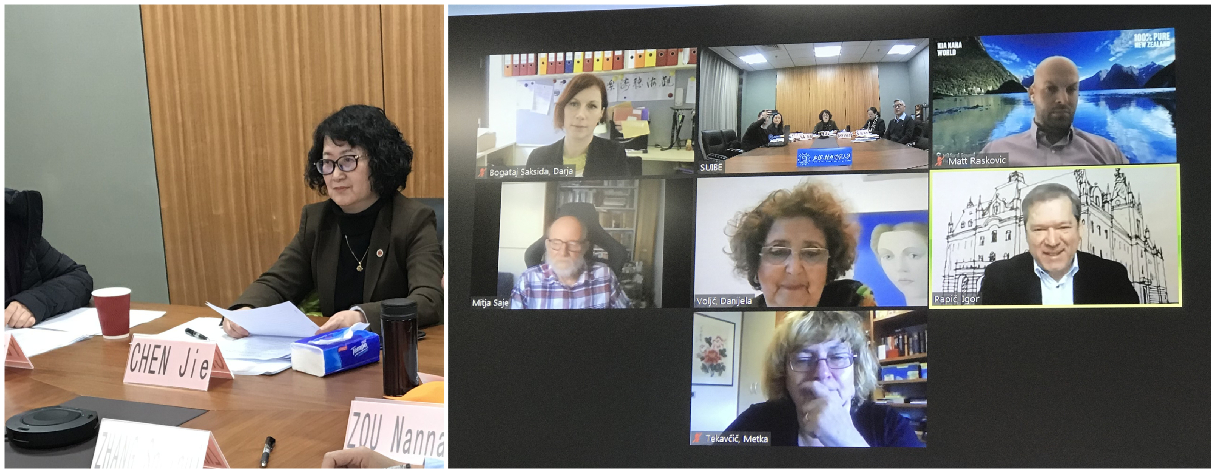 在校长双边会谈结束后,2020年度卢大孔院理事会正式召开。卢大校长Igor Papic、卢大经济学院院长MetkaTekavcic、卢大文学院汉学教授MitjaSaje、惠灵顿商学院教授MatevzRaskovic、卢大孔院外方院长DanijelaVoljc、卢大孔院项目经理DarjaSaksidaBogataj和必赢626net入口首页副校长陈洁、外事处处长兼孔子学院办公室主任邹囡囡、孔子学院事务协调人叶蓉教授以及外事处副处长张水辉、孔子学院办公室行政秘书袁自立等出席了理事会。