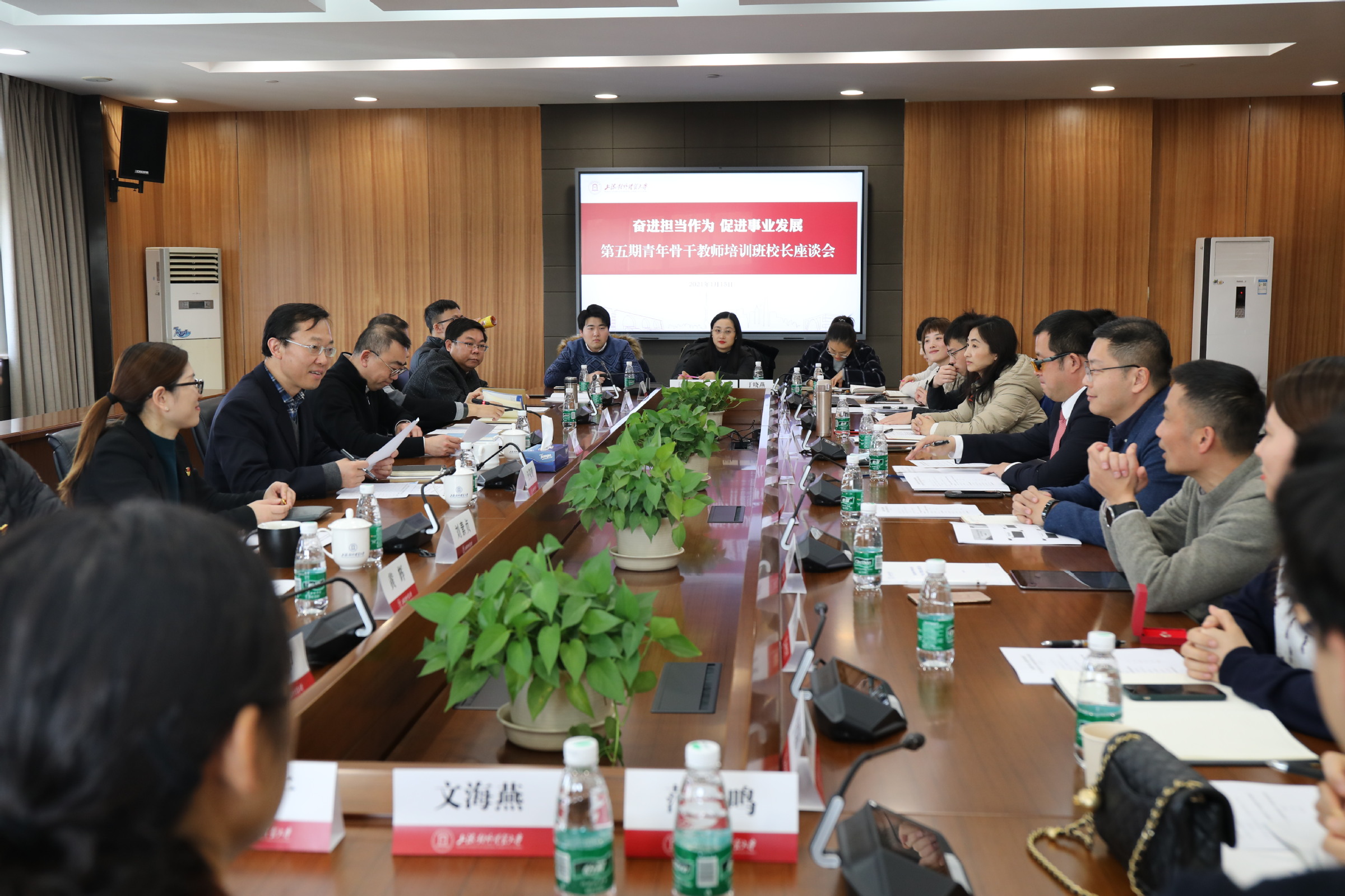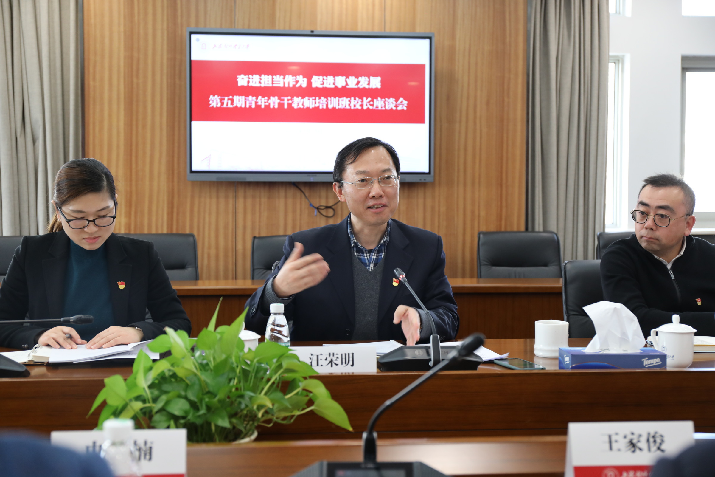 1月15日下午,汪荣明校长与学校第五期青年骨干教师培训班学员在德政楼317会议室进行座谈,校党委组织部部长、党校常务副校长严大龙,校党委组织部副部长刘素贞,第五期青年骨干教师培训班全体学员参加座谈会。会议由严大龙主持。
