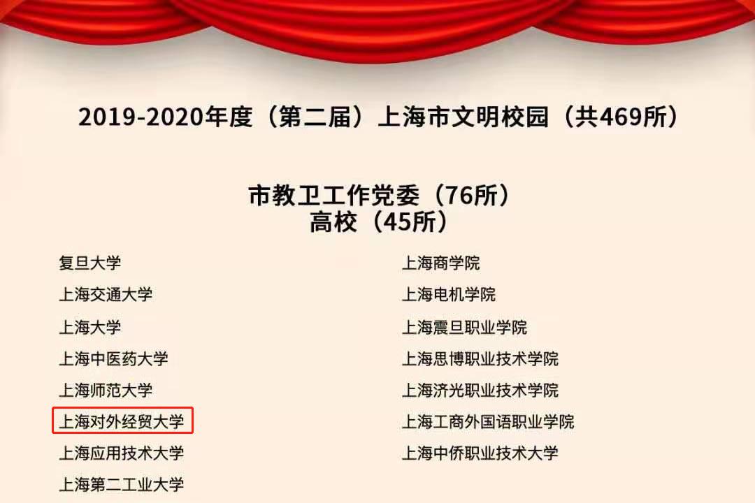 在2019-2020年度文明校园创建过程中,学校唱响主旋律,加强理想信念教育。深入开展主题教育,突出“实”字;传承弘扬精神文化,彰显“爱”字;抗疫一线党旗飘扬,强化“责”字。学校打好组合拳,夯实人才培养基础。加强师德建设,激发教师动力活力;打造金专金课,深化教育综合改革;强化创业教育,获批典型经验高校。学校力求新作为,助力贸易强国建设。深度对接服务国家战略,获批WTO亚太培训中心;多方位参与服务上海建设,积极服务进博会。学校练好基本功,共享文明创建成果。完善治理体系,提高依法治校水平;改善校园环境,提升师生幸福指数;践行绿色理念,推进生态校园建设。学校凝聚新共识,开启创新发展新征程。把深入学习贯彻党的十九届五中全会精神作为重中之重的政治任务,全面对标对表《深化新时代教育评价改革总体方案》,统筹谋划“十四五”事业改革与发展规划,进一步明确战略目标定位,厘清发展思路和重大举措。