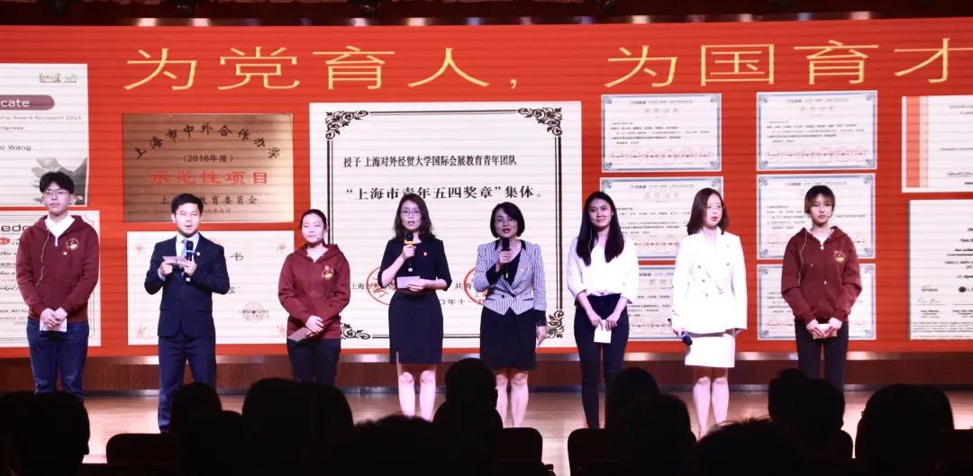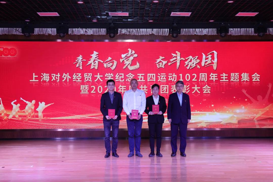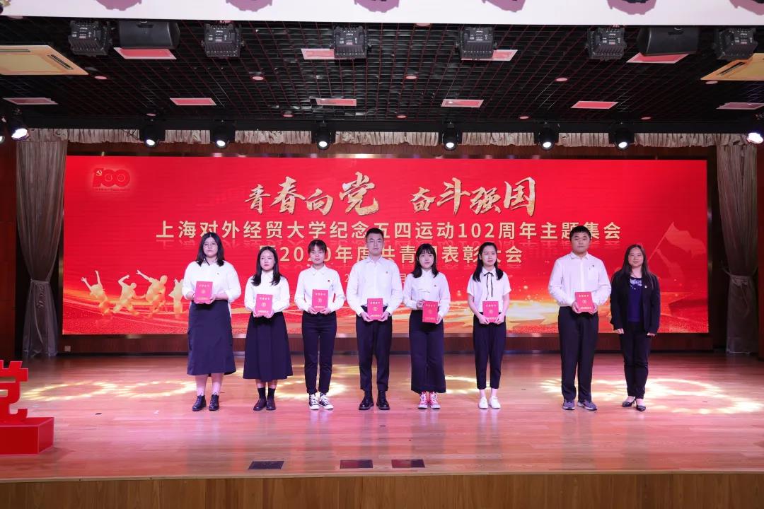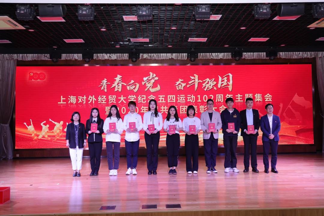 在2020年度共青团表彰仪式中,马克思主义学院“赓续信仰,筑梦前行”实践育人青年团队被授予“上海市青年五四奖章集体”称号,会展与旅游学院王元义老师、法学院宋保振老师被授予“上海市青年五四奖章个人”称号。在校级评选中,于潇行等10名同学被授予“校‘思源之星’大学生年度人物”称号,姚峪岩等10名同学被授予“校自强之星”称号;国际商务外语学院团委、金融管理学院团委、会计学院团委被授予“校五四红旗团委”称号,国贸1904等10个团支部被授予“校五四红旗团支部”称号;丁羽佳等309名团员被授予“校优秀团员”称号,华伟丰等185名团员被授予“校优秀团干部”称号;国际经贸学院团委、金融管理学院团委、法学院团委被授予“校志愿服务工作优秀组织奖”,“点点绿意,与爱同行‘点绿义卖’志愿者活动”等5个项目被授予“校优秀志愿服务项目”称号,庄怡等10名同学被授予“校杰出志愿者”称号,陈一鸣等101名同学被授予“校优秀志愿者”称号。