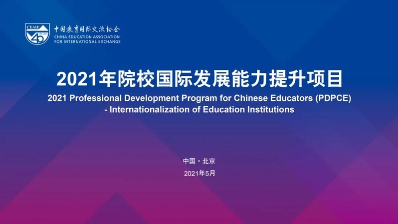 5月11日,中国教育国际交流协会2021年度首期院校国际发展能力提升项目(以下简称“项目”)在北京开幕,教育部国际合作与交流司副司长方军,上海纽约大学名誉校长俞立中和交流协会副会长、秘书长王永利出席了开幕式,来自全国百余所高校的170名外事干部参加了项目并于5月14日顺利结业。