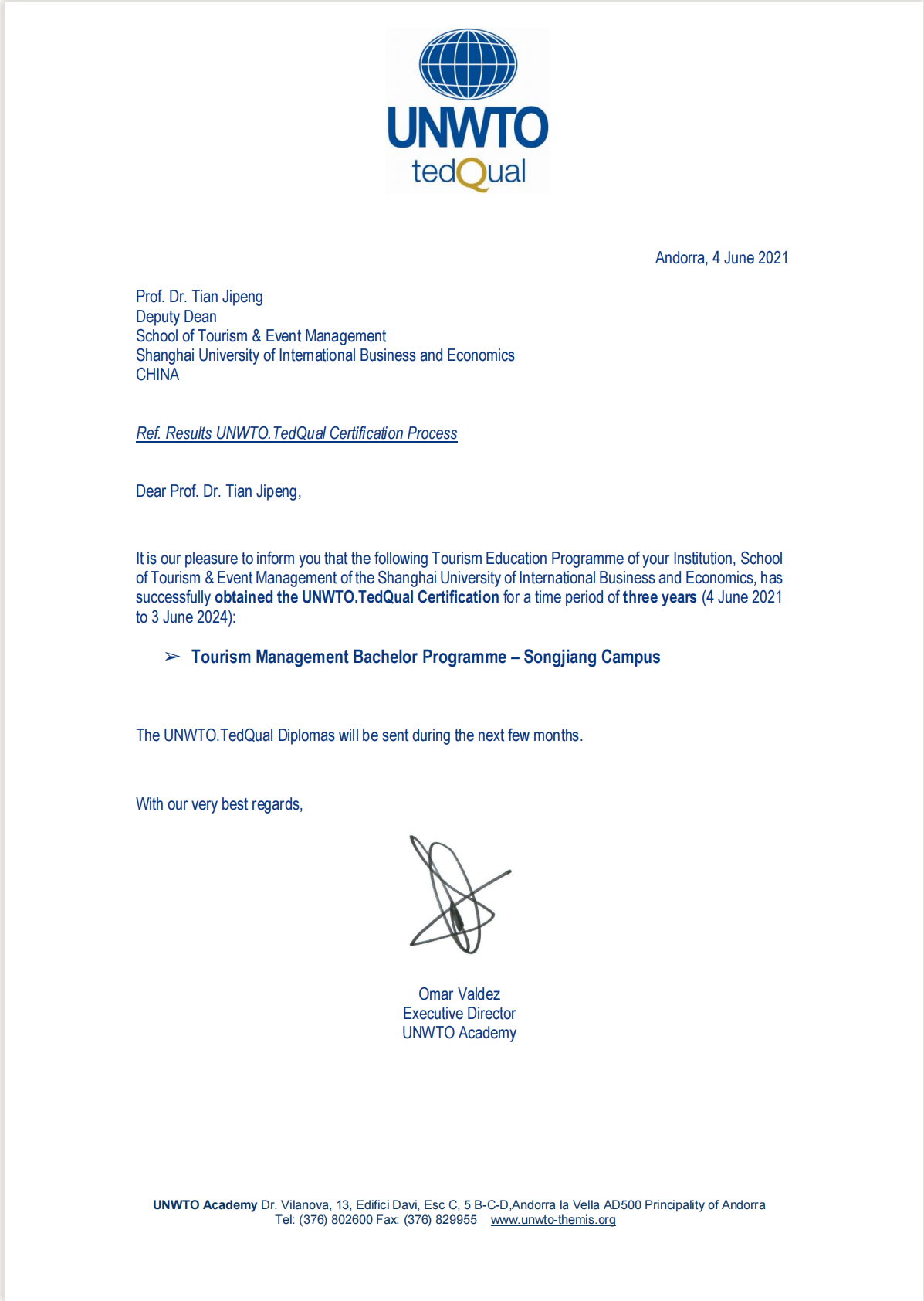 近日必赢626net入口首页接到联合国世界旅游组织旅游教育质量(UNWTO TedQual)国际认证机构通知,会展与旅游学院旅游管理专业通过该机构的旅游教育质量国际认证,认证有效期3年。必赢626net入口首页成为上海市首家通过该项认证的院校。