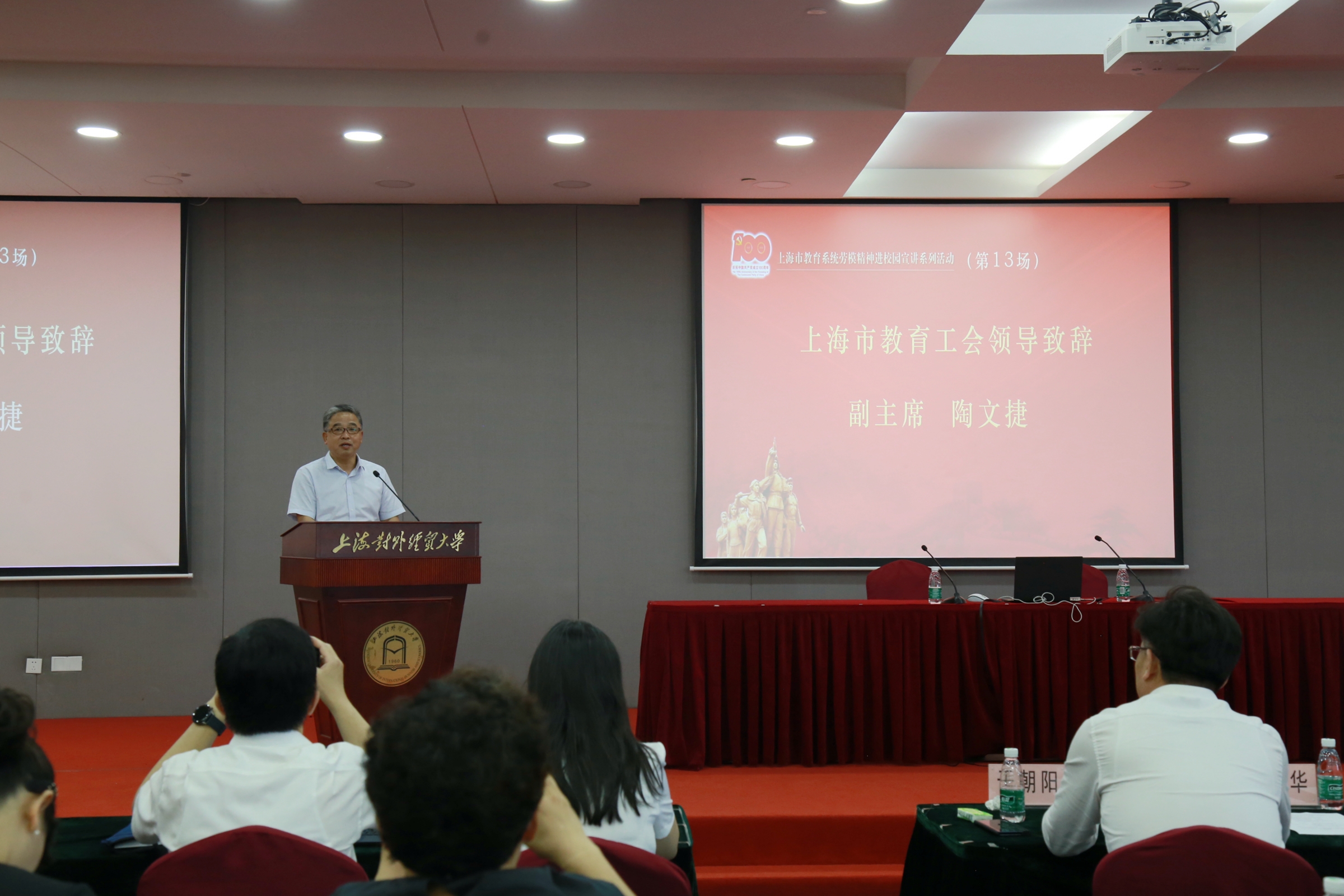 陶文捷代表上海市教育工会致辞,他介绍了本次活动的背景,强调工会系统是劳模工作的具体实施者和服务者,要采取切实有效措施将劳模精神具体化、细节化;他还强调各级工会组织要用足劳模资源,常态化开展“访劳模、爱劳模、学劳模、争当劳模”活动,持续深化劳模精神进校园、进课堂,通过劳模的言传身教,将劳动精神和工匠精神内化和影响青年师生。