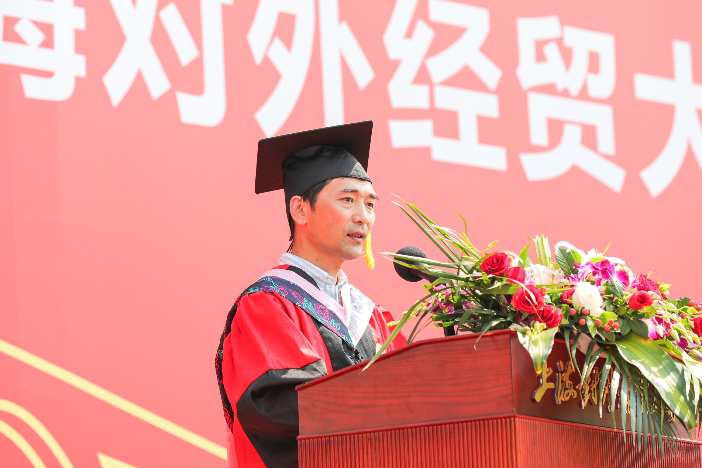 国际经贸学院李卓凝代表全体毕业生发言,上海市优秀共产党员、法学院詹德斌教授作为教师代表发言。