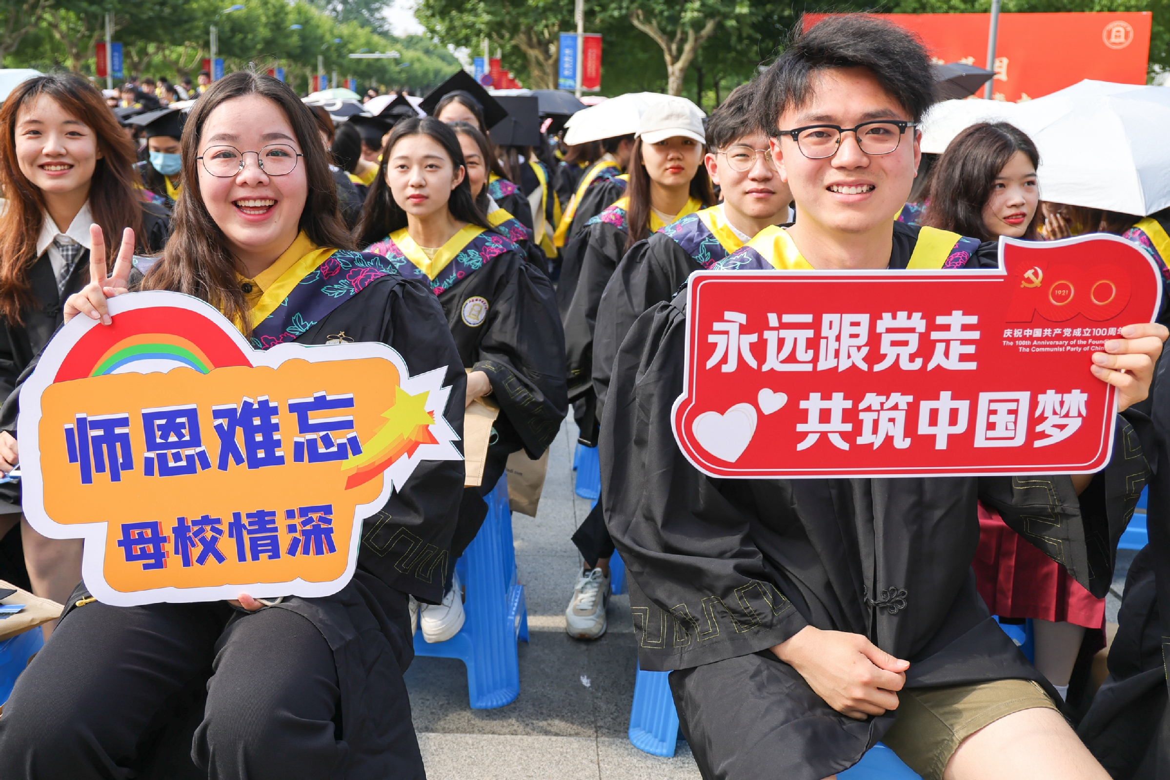 他表示,这场毕业典礼既是同学们以丰硕的学业成果向建党百年献礼的大会,也是站在“两个一百年”历史交汇点上的青春集会。他鼓励全体毕业生要向先辈致敬、向优秀看齐,做一个有大爱大德大情怀的人,以爱国之心、报国之志谱写青春之歌。