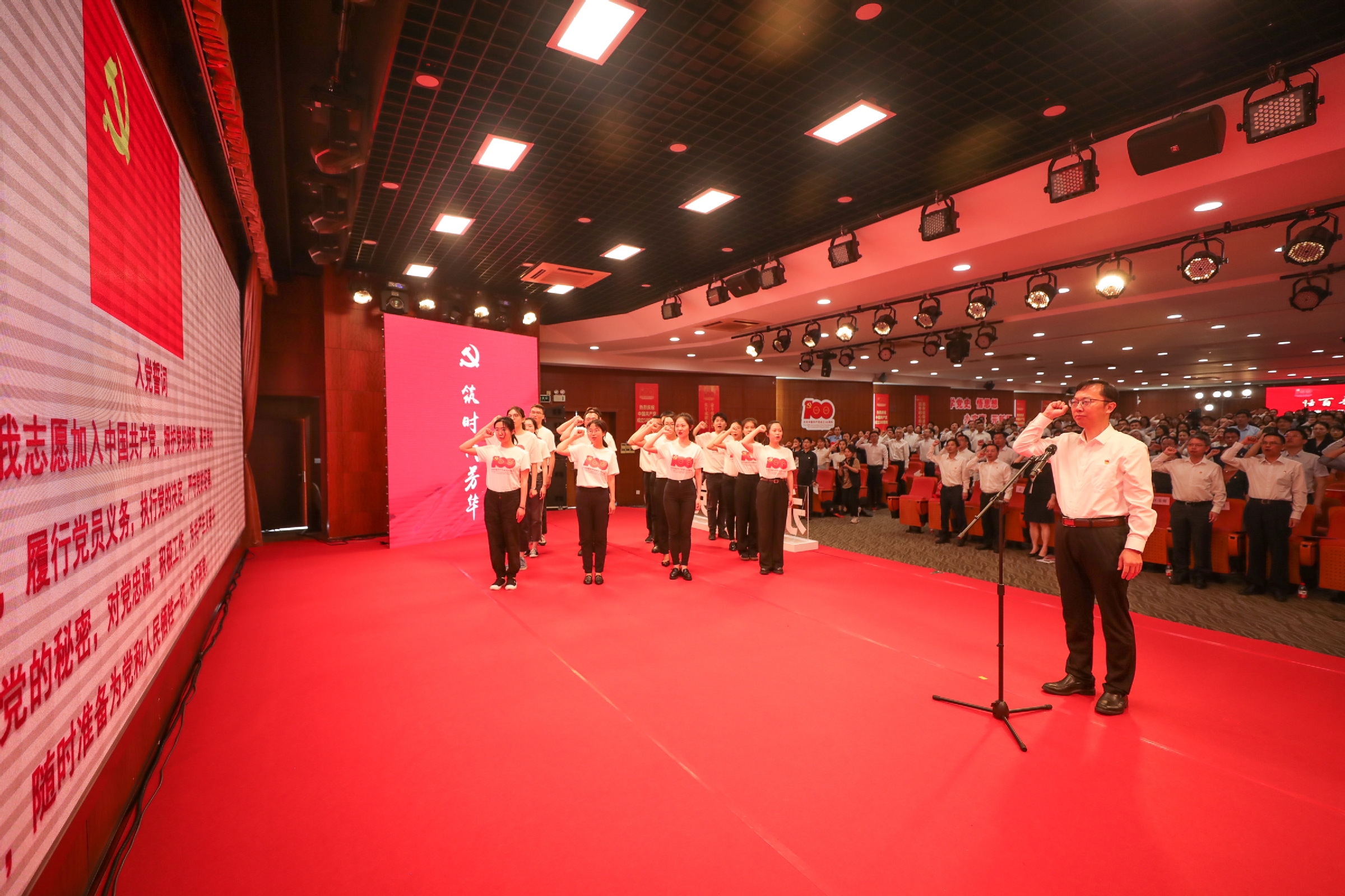 党课在校党委副书记、校长汪荣明带领新入党师生党员代表、与会党员师生重温入党誓词中推向高潮。“我志愿加入中国共产党,拥护党的纲领,遵守党的章程,履行党员义务……”铮铮誓言,久久回响,振奋人心。