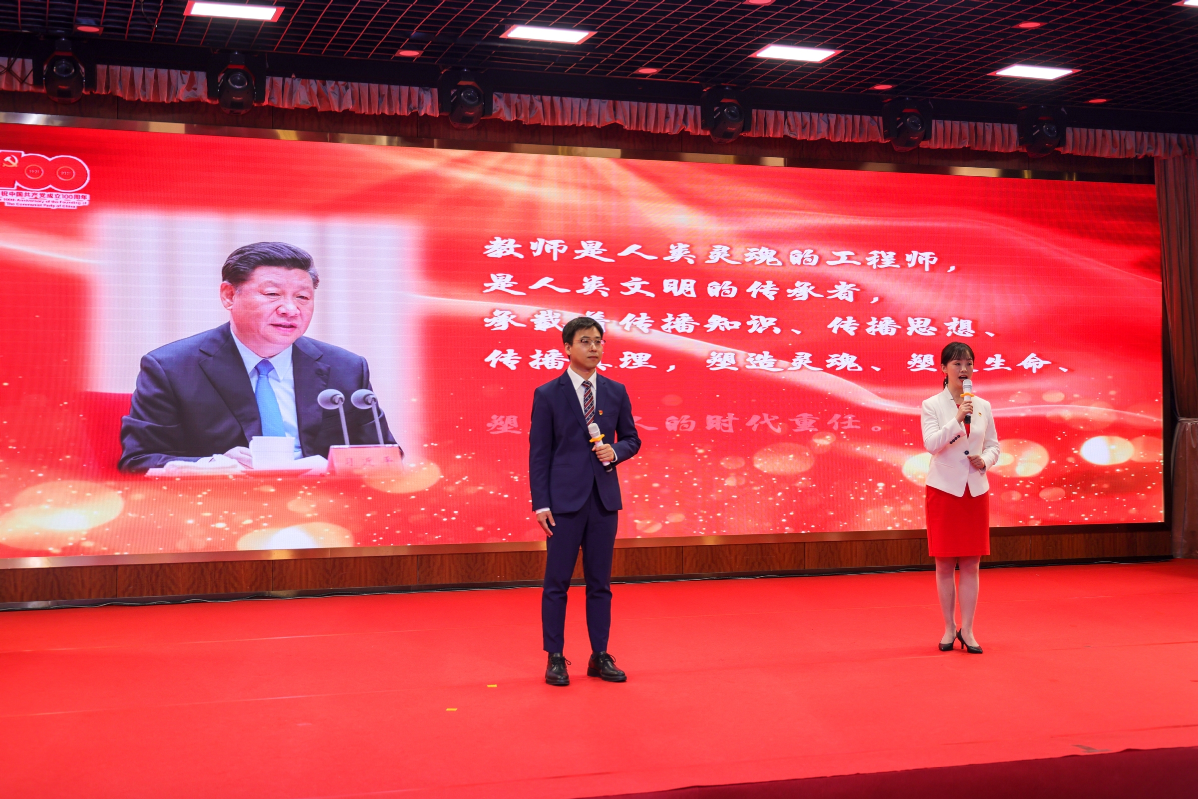 本次示范党课积极创新党课形式,将党史学习教育搬到舞台,分为“序篇•信仰之光”、“学党史•悟思想•铸党魂”、“忆峥嵘•溯初心•担使命”、“跟党走•树标杆•勇争先”和“尾声•星辰大海”五个部分,以诗歌朗诵、专题党课、视频访谈、现场讲述、情境演讲等多种表现形式,将党史学习教育与庆祝中国共产党成立100周年主题活动有机融合。