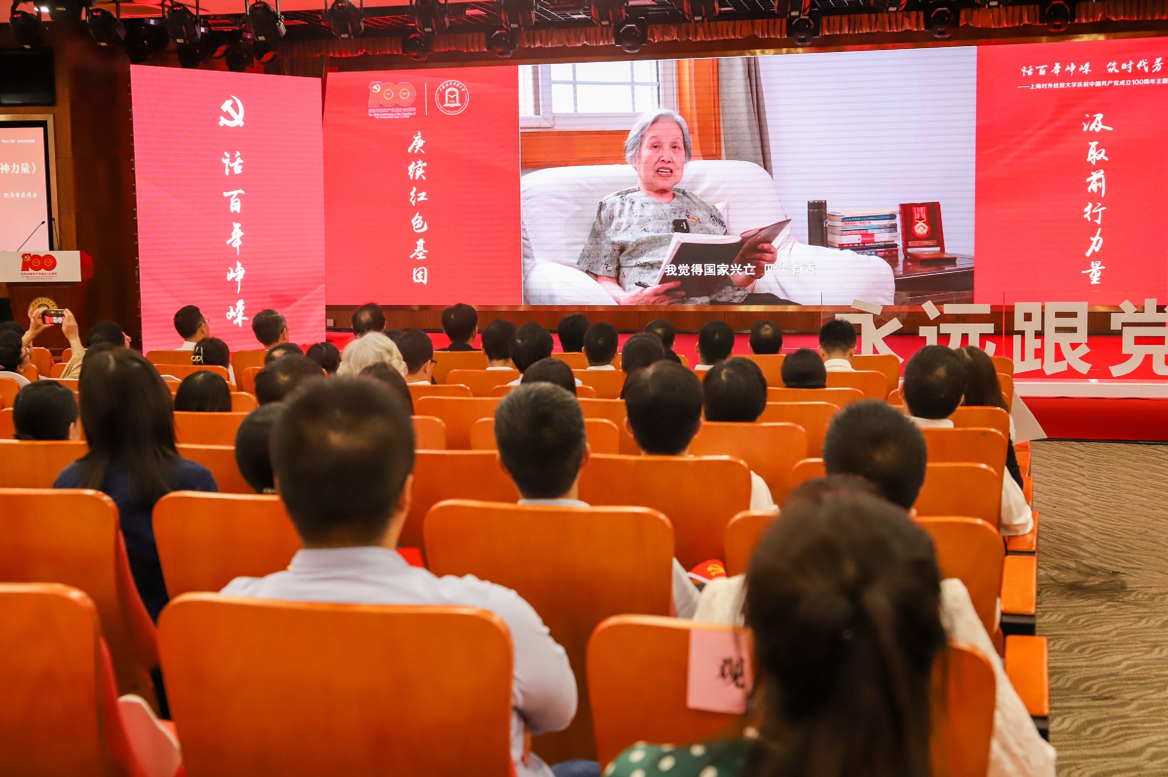 第二篇章以讲述的形式展开。首先通过视频《赓续红色基因 汲取精神力量》展现了学校图书馆原党支部书记、馆长、“中国人民志愿军抗美援朝出国作战70周年”纪念章获得者、“光荣在党50年”纪念章获得者卢江同志参加抗美援朝出国作战的革命事迹以及为党和国家奉献终身的精神气概。卢江同志的亲身经历和深情讲述深深感动了在场师生。随后,学校优秀共产党员、WTO亚太培训中心执行主任、贸易谈判学院副院长应品广和优秀党务工作者、国际商务外语学院教师胡筱颖以“希望”、“责任”、“热爱”为关键词,共同进行了《矢志育人心 甘为筑梦人》主题讲述。最后,辅导员朱晋赤、张斌,研究生党员杨晨,本科生党员魏鼎城带来了情境演讲《立大志 明大德 成大才 担大任》。