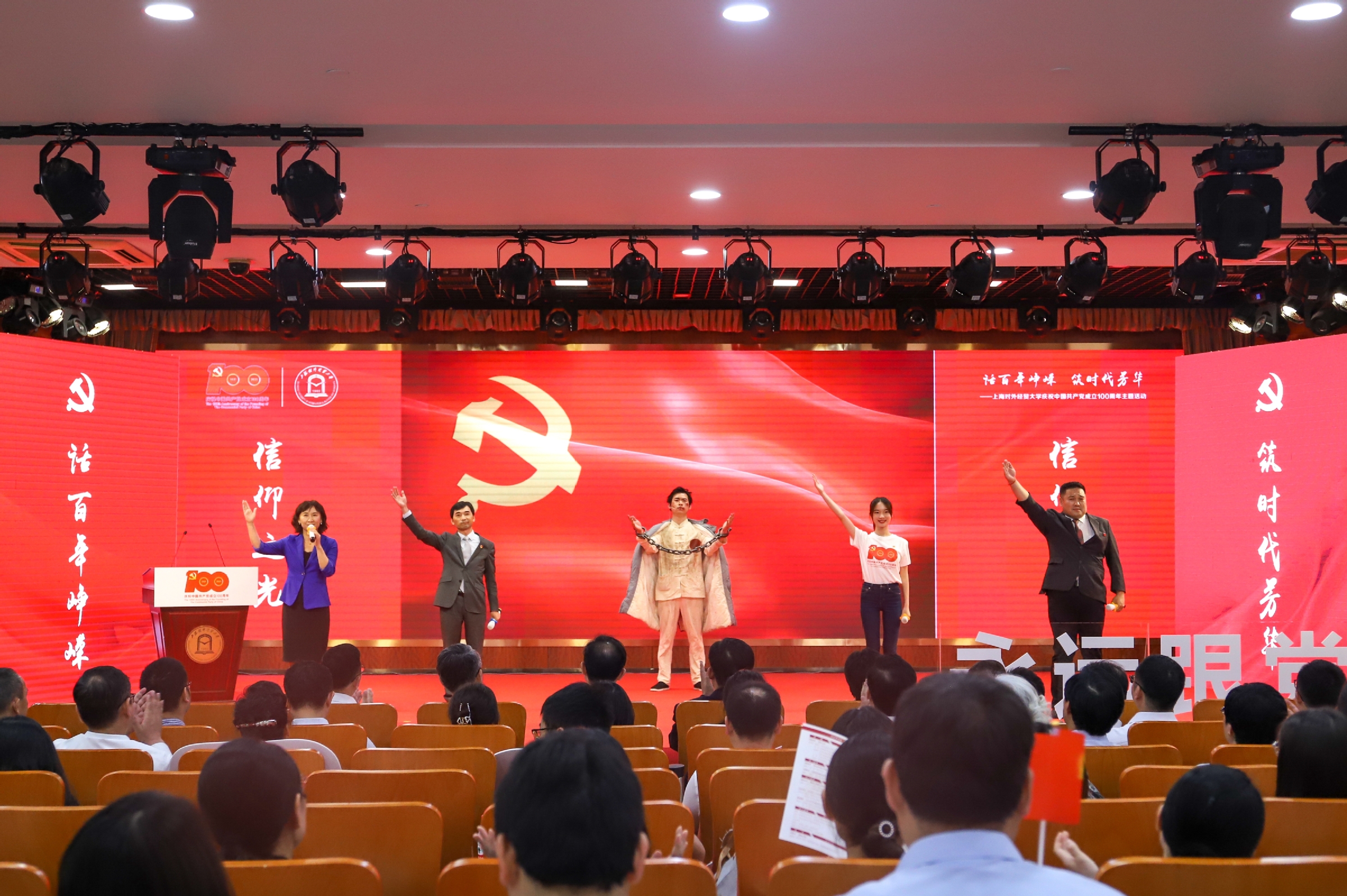 在“序篇”环节,上海市优秀共产党员、上海市教卫工作党委系统优秀共产党员•师德标兵、法学院教师詹德斌,上海市教卫工作党委系统优秀党务工作者、会计学院党委书记张嵘,民进全国社会服务暨脱贫攻坚工作先进个人、上海市脱贫攻坚先进个人、会展与旅游学院教师梁振民,学生党员代表沈杭、学生团员代表朱婧如朗诵了诗歌《信仰之光》,通过与革命先烈方志敏跨越时空的对话,回应方志敏先烈狱中所写《可爱的中国》,汇报建党100年来国家的发展和成就,感受爱国烈士对党对国家的英勇奉献,以先辈的精神为灯塔,锐意进取、积极有为,为中华民族的伟大复兴做出新的更大的贡献。