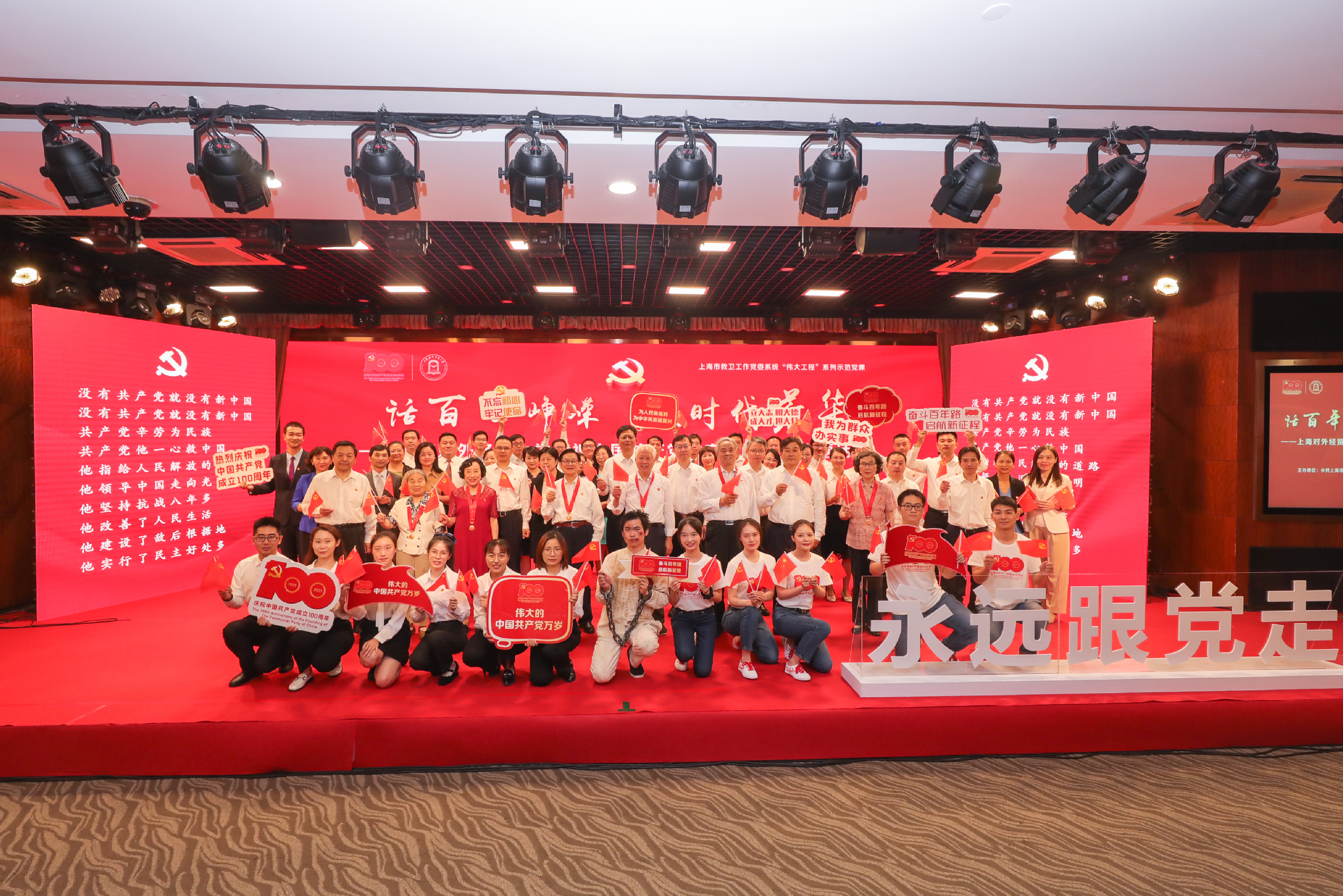 为热烈庆祝中国共产党成立100周年,深入开展党史学习教育,6月29日下午,以“话百年峥嵘 筑时代芳华”为主题的市教卫工作党委系统“伟大工程”系列示范党课暨必赢626net入口首页庆祝中国共产党成立100周年主题活动在松江校区图文信息大楼507报告厅举行。全体校领导、中层干部、党支部书记、专兼职组织员和党员师生代表400余人参加了活动。