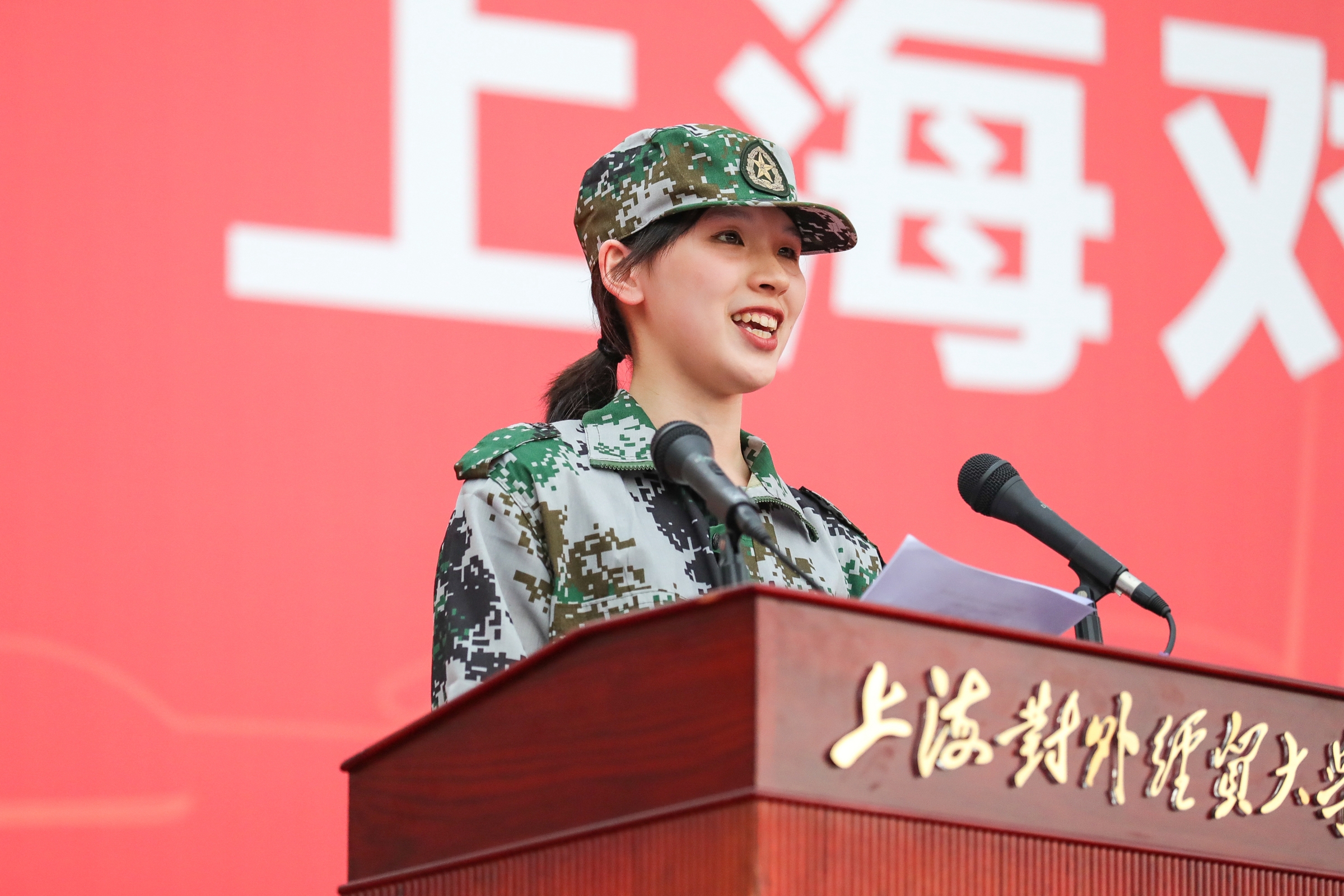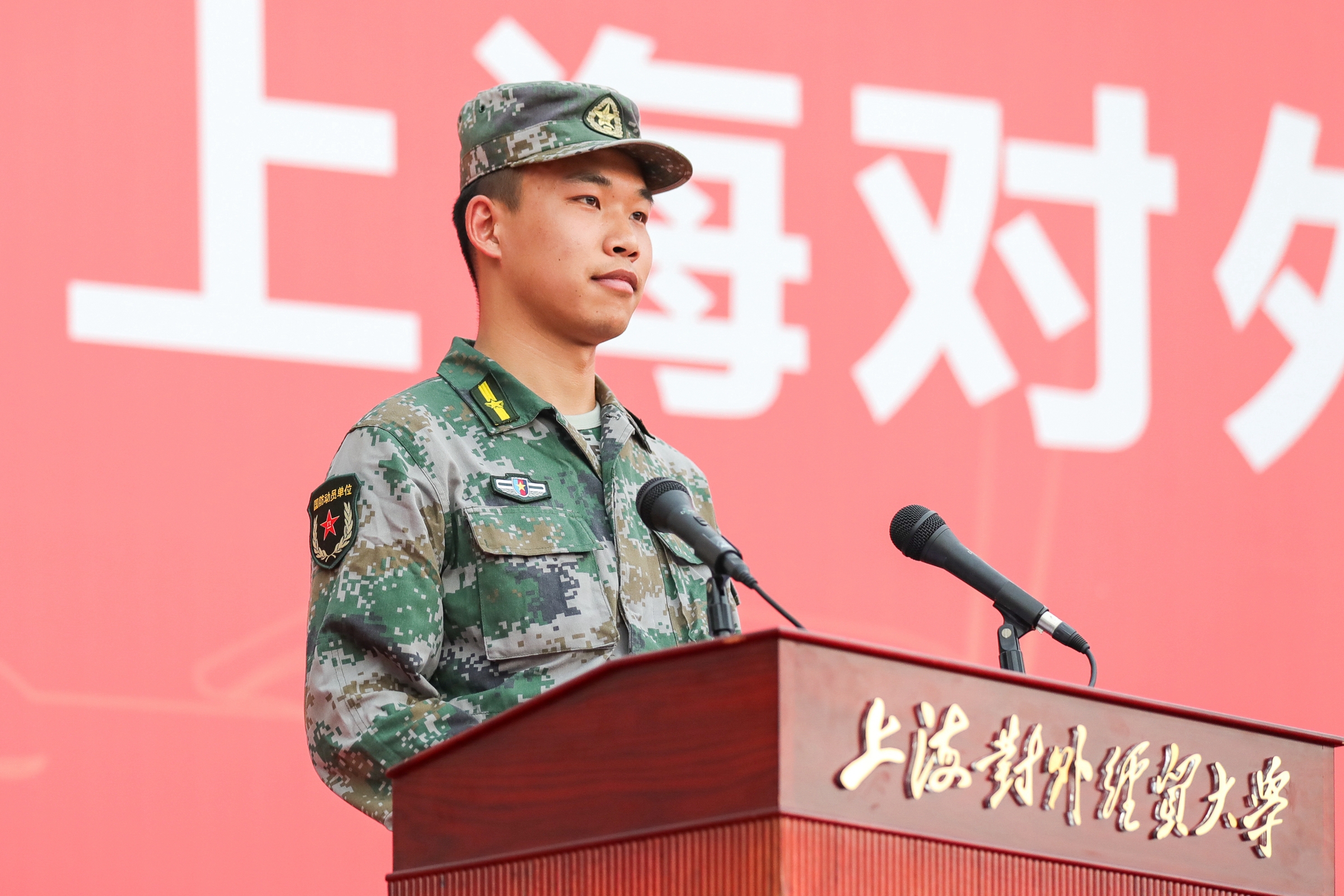 军训旅二团四连朱嘉乐同学代表受训学员发言。她表示,作为青年一代的我们,要向这和平昌盛年代的英雄学习,不怕苦、不畏难、不畏牺牲,用臂膀扛起如山的责任。她代表全体学员向学校领导、老师以及各位教官庄严承诺:将会以饱满的热情投入到军训中,以上经贸大人的精神、品质和气魄为目标,高标准、严要求地完成本次军训。