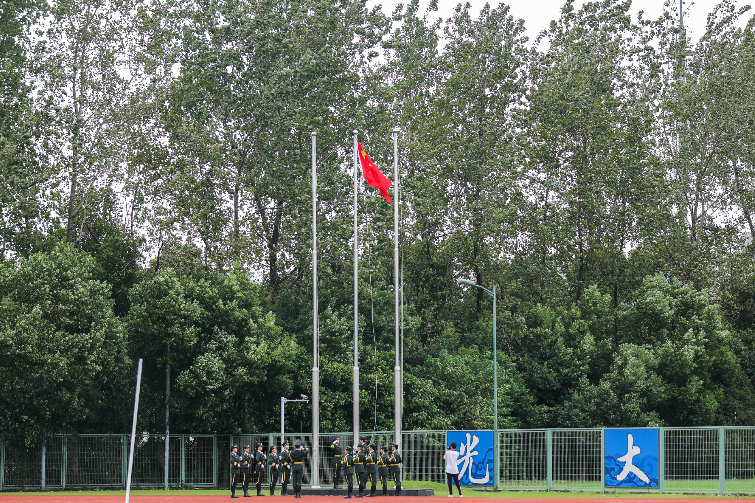 伴随着激昂的乐曲声,校国旗护卫队迈着铿锵有力的步伐,昂首阔步护卫国旗走向升旗台,数千名师生整齐列队行注目礼。庄严的升旗仪式后,开学典礼正式开始。
