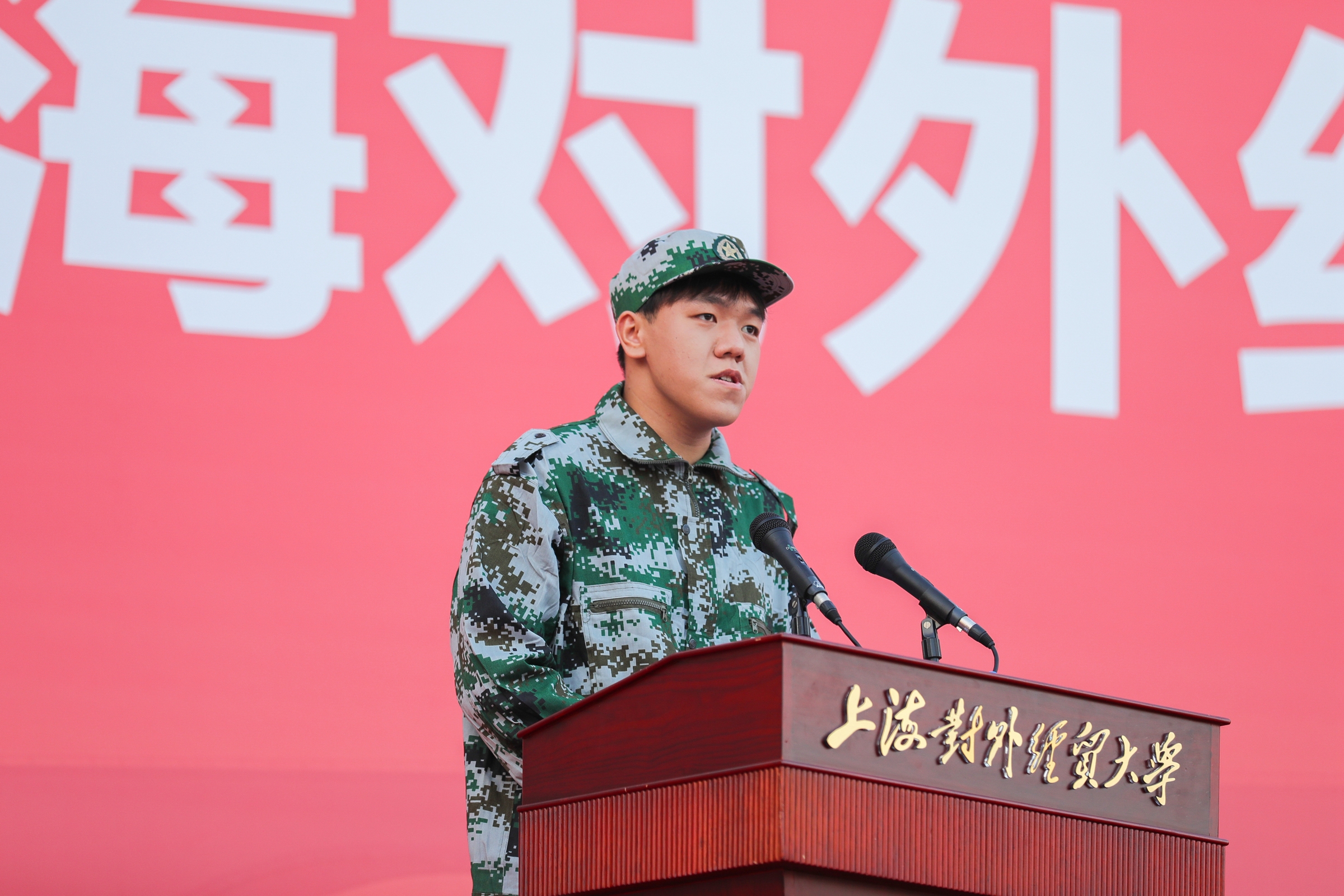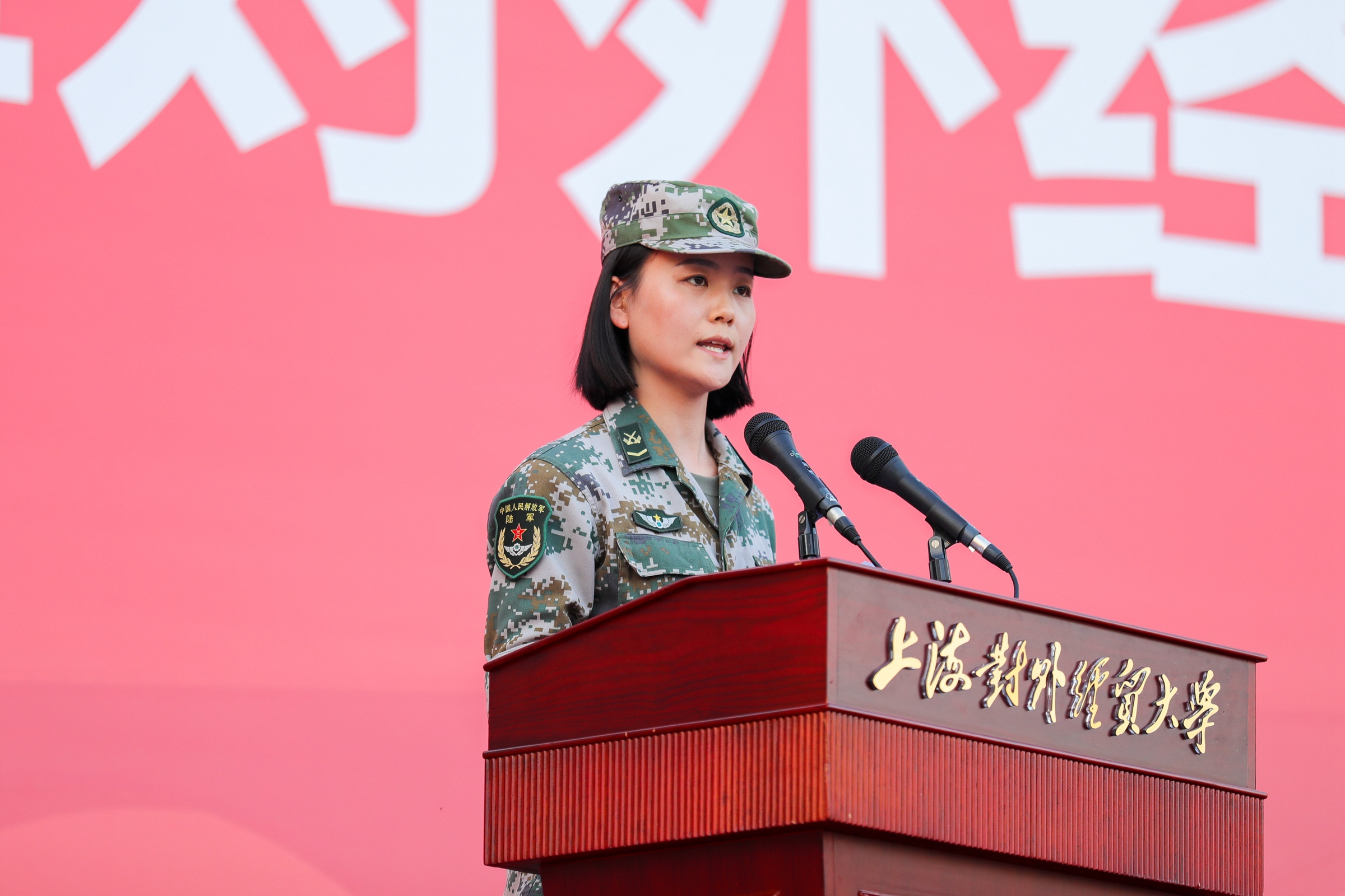 军训学员代表、军训旅一团一连周子阳代表受训学员发言。他代表全体学员庄严承诺:努力克服军训中的困难,用拼搏和汗水冲刷娇气和稚气,用激情和斗志打响新征程的第一枪。