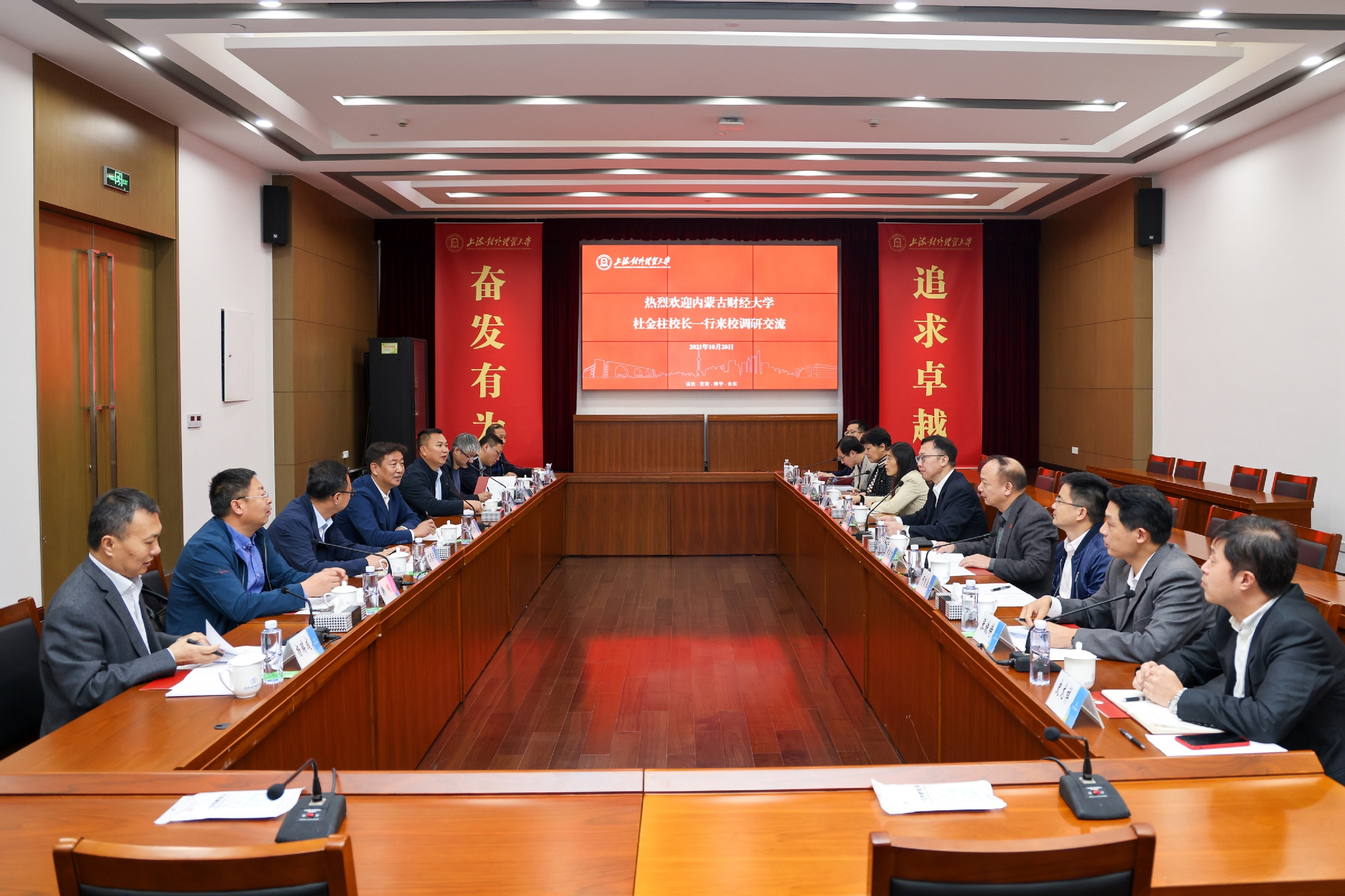 10月20日下午,内蒙古财经大学校长杜金柱一行来必赢626net入口首页调研交流,校长汪荣明在古北校区会见并主持座谈会,两校相关部门负责人参加座谈交流。