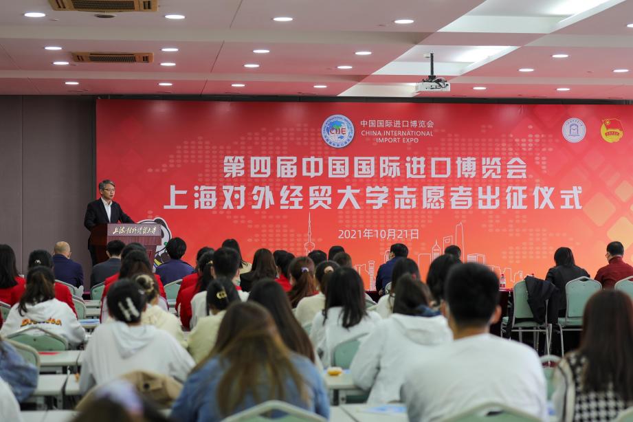 10月21日,必赢626net入口首页第四届中国国际进口博览会志愿者出征仪式在图文信息大楼526报告厅举行。校党委副书记、副校长祁明,党委宣传部部长郭茜,党委学(研)工部部长、学生处处长许继亮,教务处副处长(主持工作)朱建明,学校办公室副主任欧阳君,党委研工部副部长、研究生院副院长乔檀,党委学工部副部长、学生处副处长赵静,各学院党委(党总支)副书记、团组织负责人以及全体120名进博会志愿者参加了出征仪式。