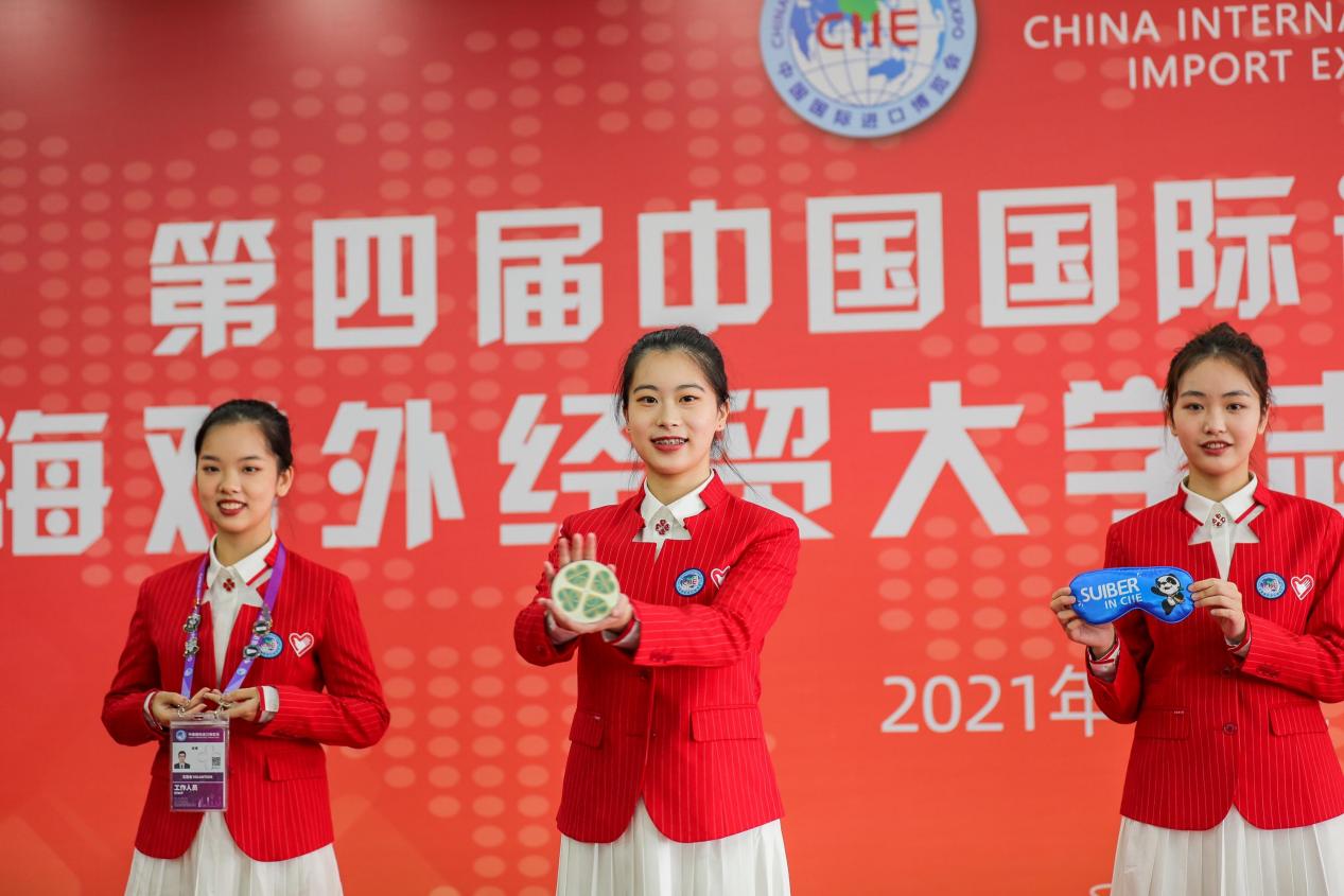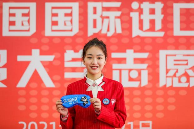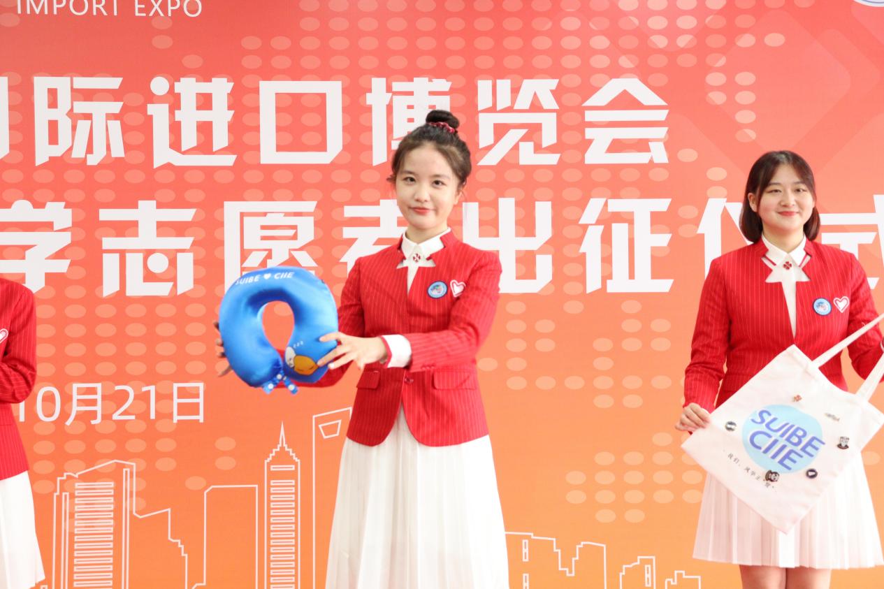 出征仪式现场还发布了进博U形枕、帆布包、眼罩、杯垫等进博会志愿者文创产品。