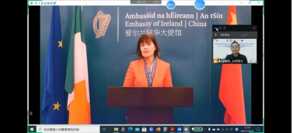 爱尔兰驻华大使安·德尔温(H. E. Ann Derwin)通过视频先后用汉语、英语和爱尔兰语致谢,并回顾了中爱交往的悠久友好历史,向大会发表了热情洋溢、颇具凯尔特色彩的讲话。