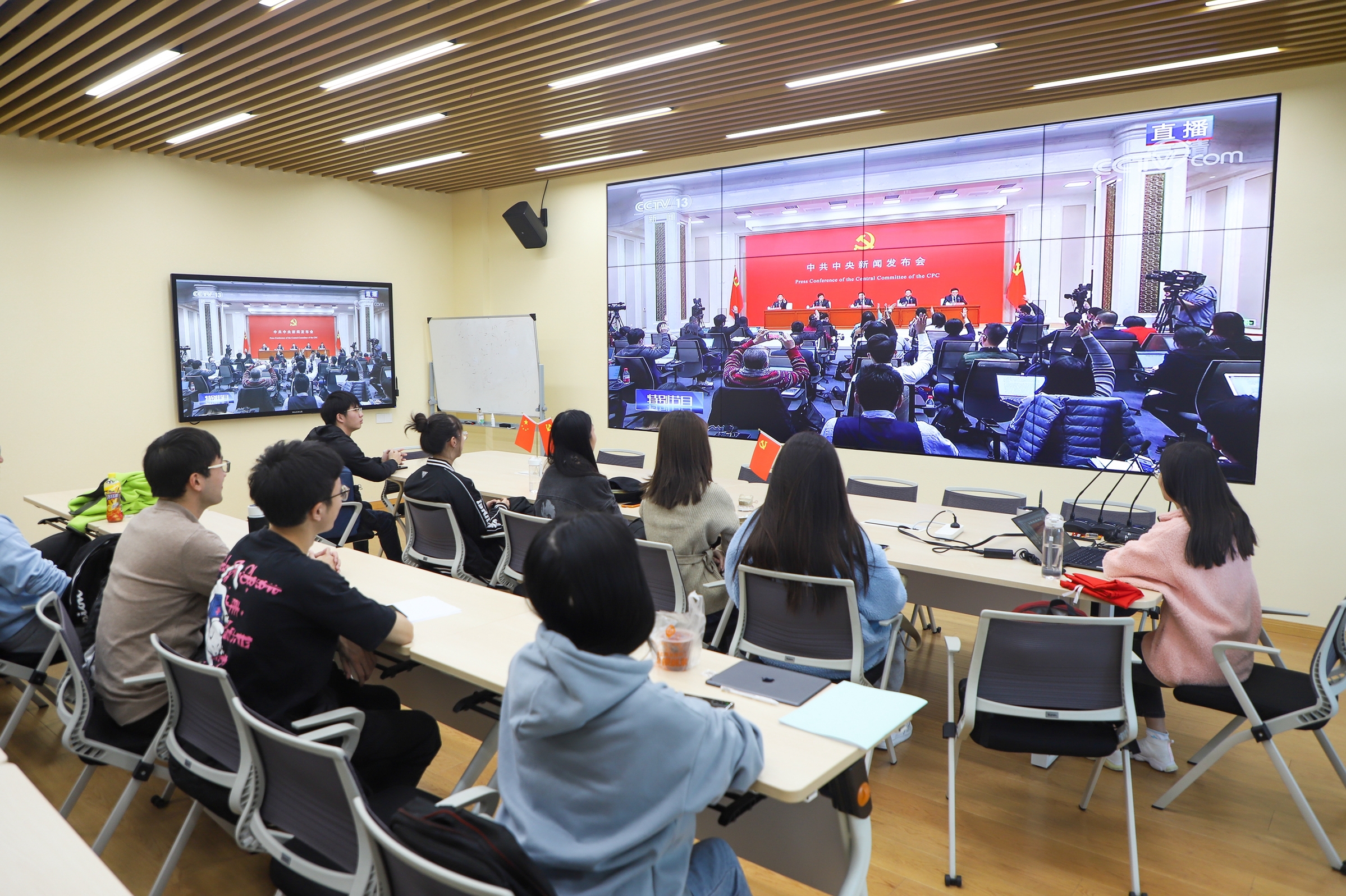 11月12日上午,学校组织部分师生收看了中共中央举行的介绍党的十九届六中全会精神新闻发布会。大家纷纷表示,要深入学习贯彻全会精神,更加紧密地团结在以习近平同志为核心的党中央周围,全面贯彻落实习近平新时代中国特色社会主义思想,凝心聚力、勇毅前行,奋发有为、追求卓越,以更加昂扬的姿态迈进新征程、建功新时代。