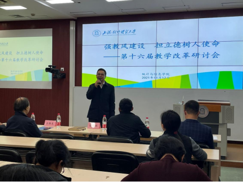 11月12日下午,统计与信息学院在松江校区信息楼532室举办主题为“强教风建设,担立德树人使命”第十六届教学改革研讨会。上海市教卫工作党委系统优秀共产党员·师德标兵、上海高校教学名师、上海交通大学特聘教授、自然科学院常务副院长王维克和上海市教学成果奖、上海市优秀教材奖获得者、东华大学“学生心目中的好老师”、东华大学理学院副院长胡良剑应邀作主题报告。副校长徐永林出席会议并讲话。会议由统计与信息学院院长刘永辉主持。