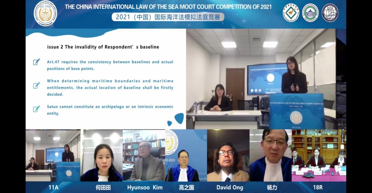 (中国)国际海洋法模拟法庭竞赛由中国海洋法学会、武汉大学中国边界与海洋研究院举办,是中国国内首创的国际性全程英文模拟法庭竞赛,也是全球首个国际海洋法模拟法庭竞赛。该比赛选取海洋法的热点问题,模拟适用《联合国海洋法公约》第十五部分规定的国际海洋法法庭、国际法院和《公约》附件七仲裁程序,旨在为参赛同学提供学习和探讨当前海洋法领域热点前沿问题的平台和机会。决赛由包括国际法庭法官及国际法、海洋法领域专家组成的裁判小组裁决,在目前国际上同领域竞赛中规格最高、参赛规模最大。比赛以英文为官方语言,采用提交书状和开庭陈述辩论的形式决出胜负。通过参与海洋法的训练和模拟比赛,学生的法律功底、语言能力、法律实践水平和实战能力获得很大提高。