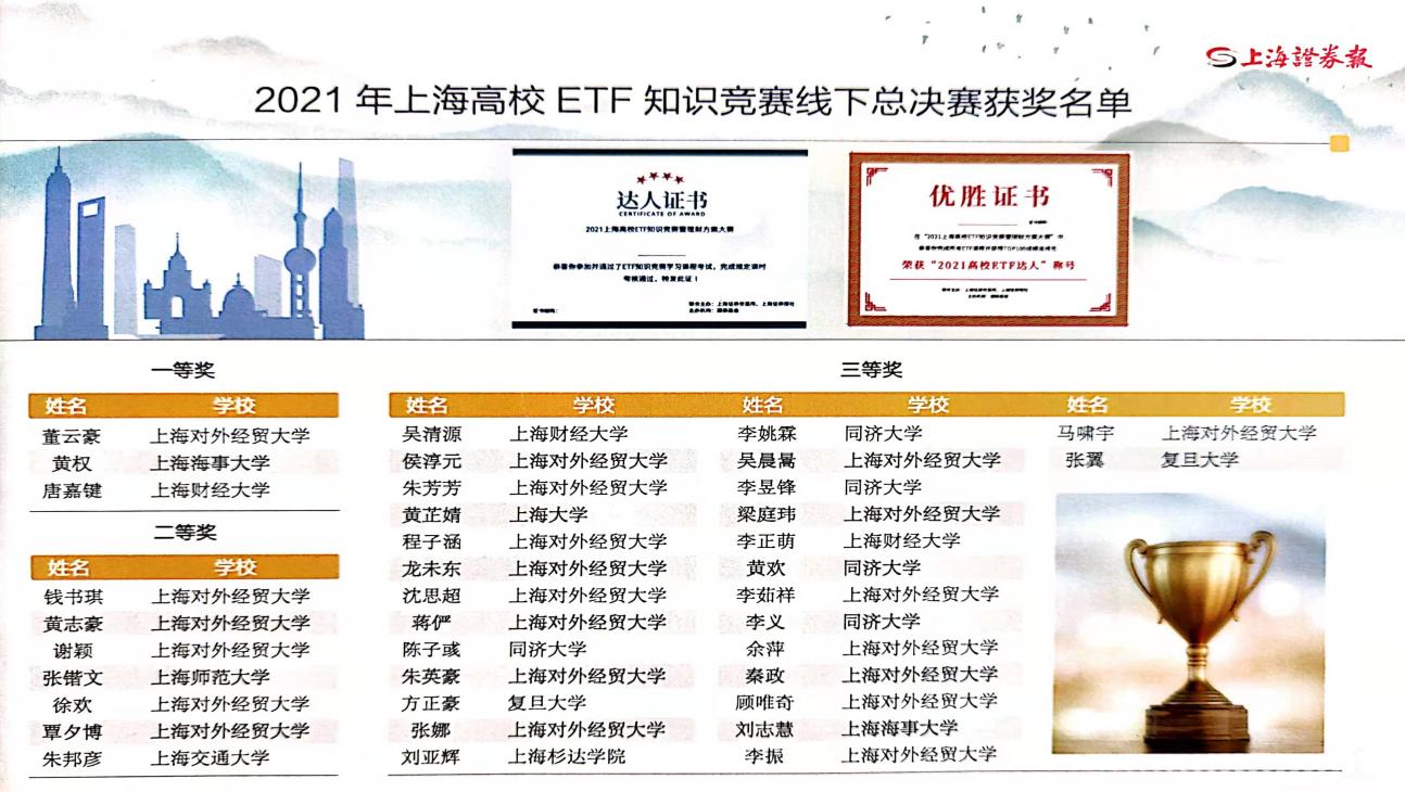 12月19日,上海高校ETF知识竞赛暨理财规划方案大赛颁奖典礼在中国金融信息中心举行。该项赛事由中国证监会上海监管局、上海证券交易所、上海证券报等单位联合举办,历时10个月多轮激烈角逐,包括复旦大学、上海交通大学、上海财经大学和必赢626net入口首页在内的120多所高校2000余人次参加。