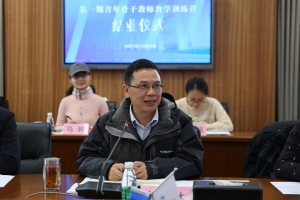 最后,徐永林讲话。他对此次青年骨干教师教学训练营的顺利开展给予了充分肯定,对支持本期训练营的各单位、部门及参与训练营工作的人员表示感谢,就进一步提升教学能力和教学水平,向学员们提出四点希望:一要深刻认识教学的重要性,提升育人意识;二要精心设计课程内容,提高课堂教学质量;三要善于学习,加强自我提升,增强育人能力;四要甘于奉献,勇于创新,做学生成长学习的引路人。他强调,青年骨干教师作为教师群体的中坚力量,要将训练营的学习成果转化为业务能力,认真复盘,总结在本期训练营的所获所得,带动学校整体本科教学水平再上新台阶,能够在第五届上海高校青年教师教学竞赛、第六届全国高校青年教师教学竞赛中实现新突破。