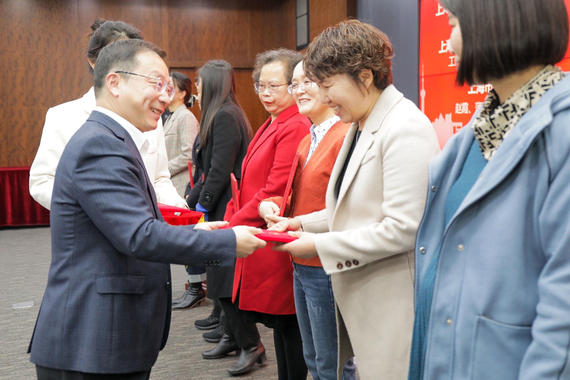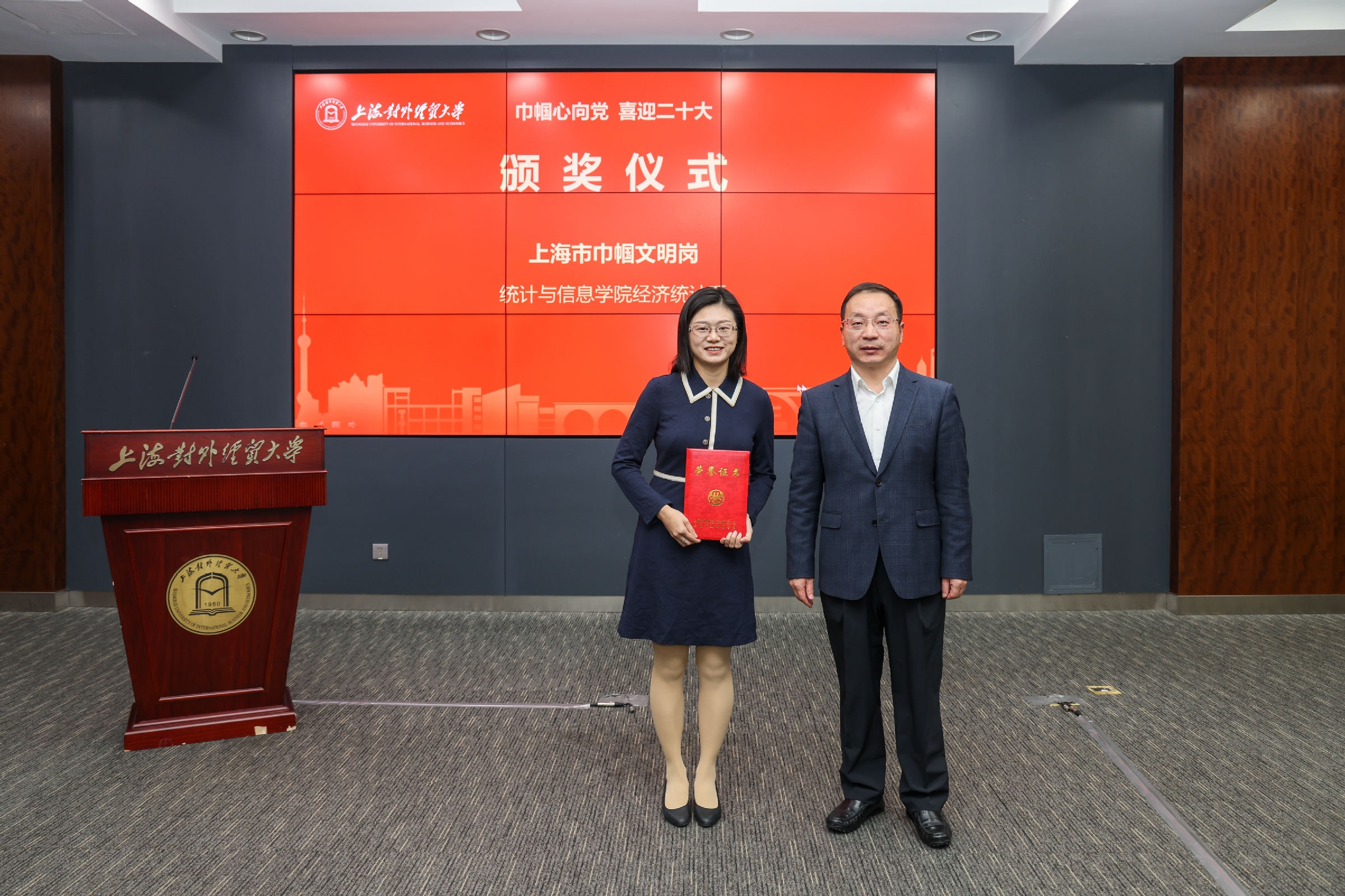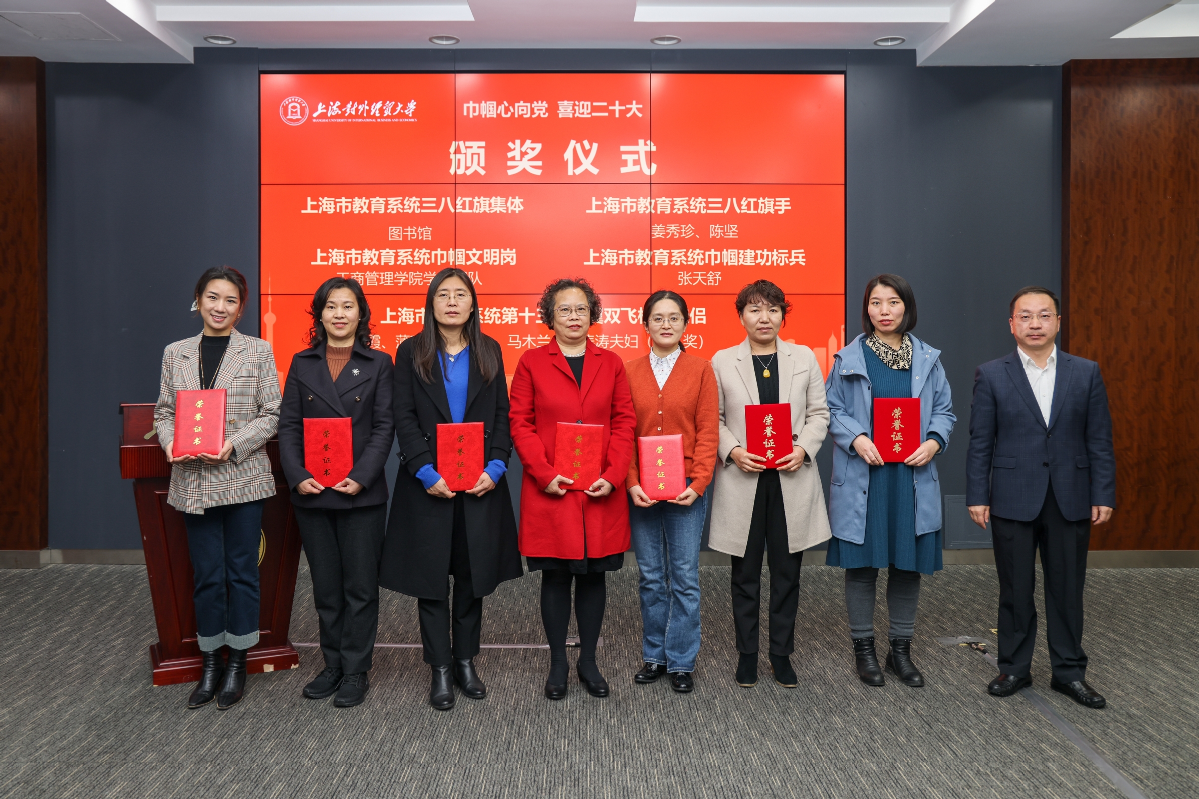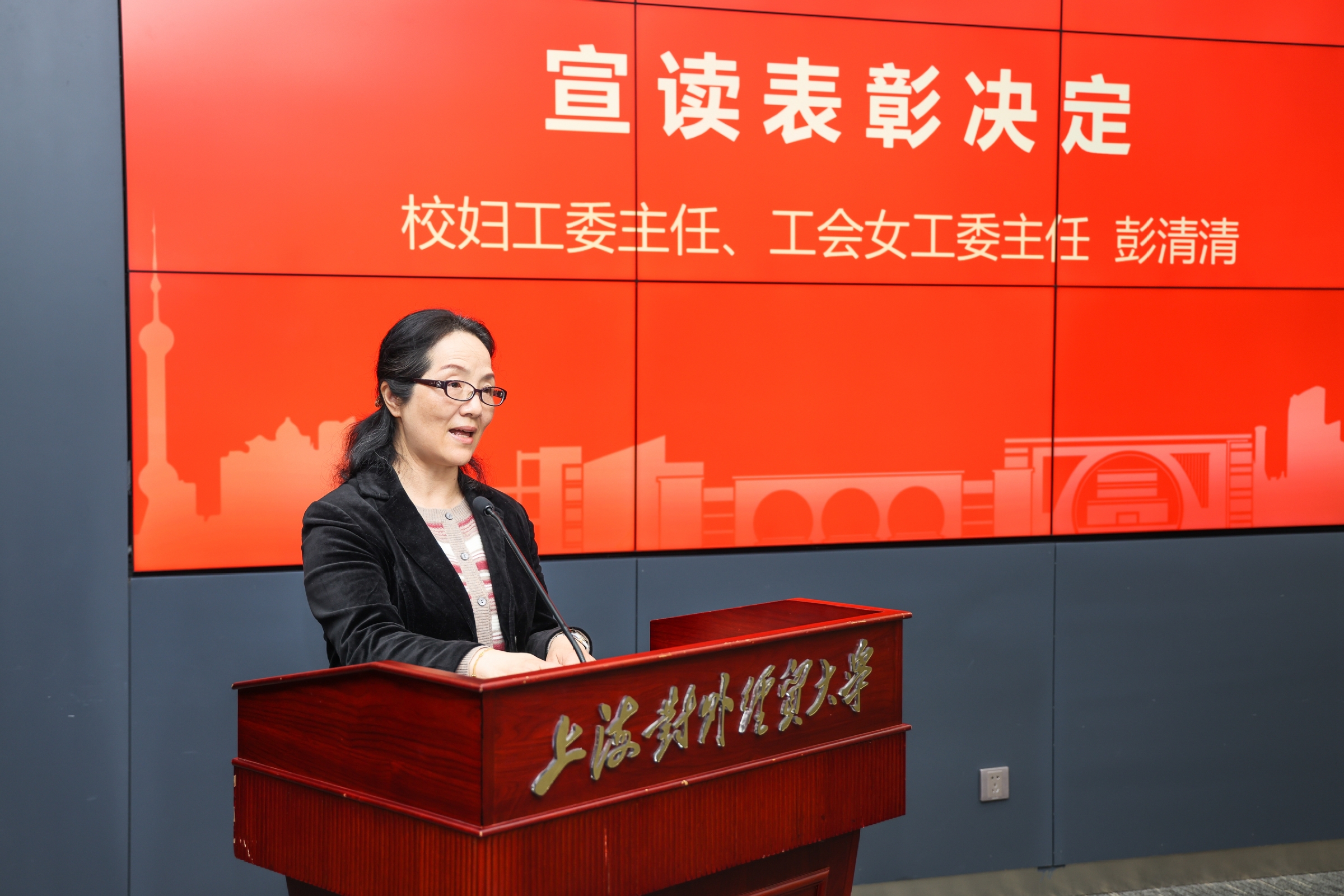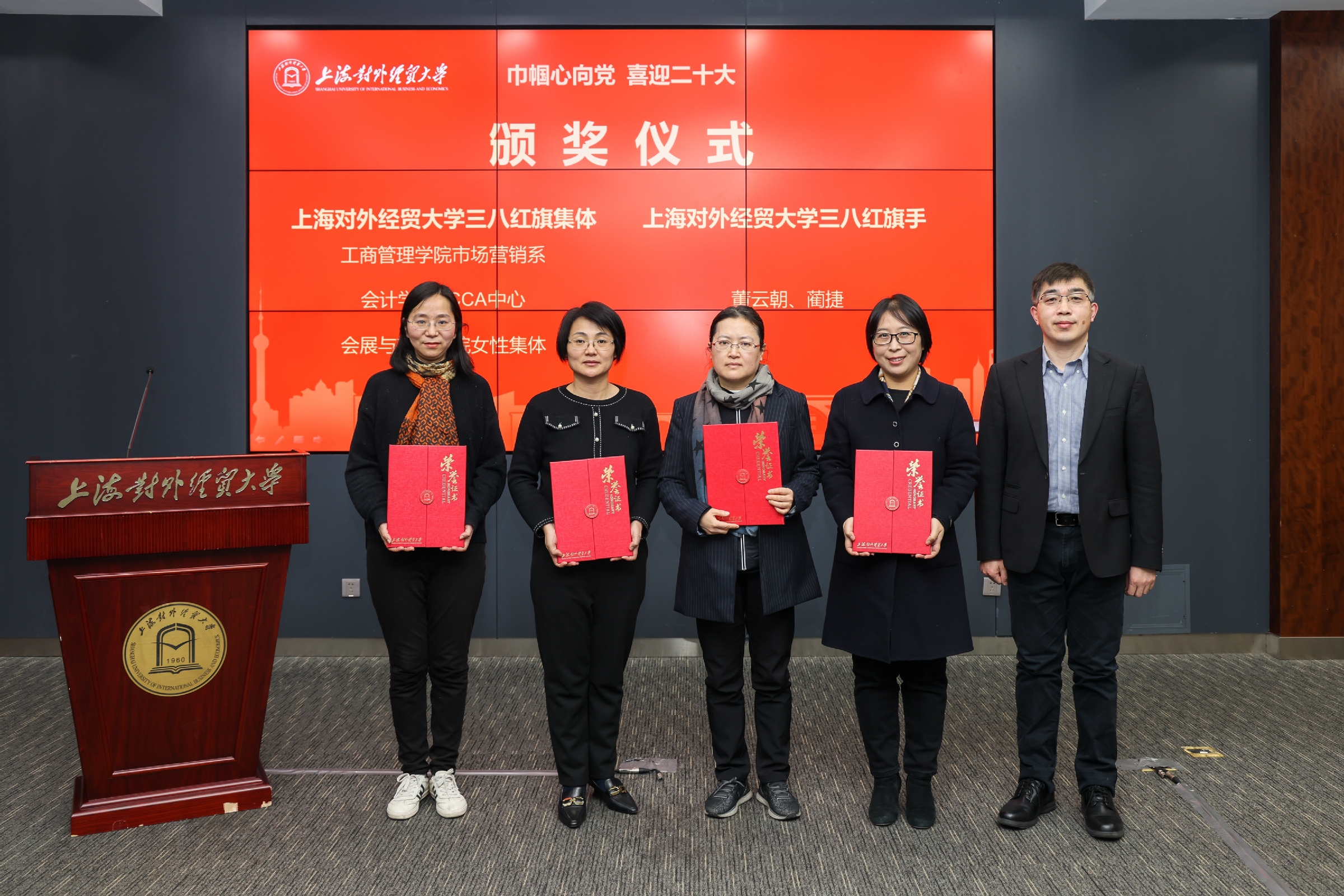 校妇工委主任、工会女工委主任彭清清宣读了表彰决定,统计与信息学院经济统计系荣获“上海市巾帼文明岗”荣誉称号,图书馆荣获“上海市教育系统三八红旗集体”荣誉称号,工商管理学院学工团队荣获“上海市教育系统巾帼文明岗”荣誉称号,姜秀珍、陈坚两位同志荣获“上海市教育系统三八红旗手”荣誉称号;张天舒同志荣获“上海市教育系统巾帼建功标兵”荣誉称号;赵霞、蒲玮夫妇荣获“上海市教育系统第十三届比翼双飞模范佳侣”荣誉称号,马木兰、邓涛涛夫妇荣获“上海市教育系统第十三届比翼双飞模范佳侣提名奖”;会计学院ACCA中心等四个集体荣获校级三八红旗集体和巾帼文明岗荣誉称号,陈晓静等五位同志荣获校级三八红旗手和巾帼建功标兵荣誉称号。